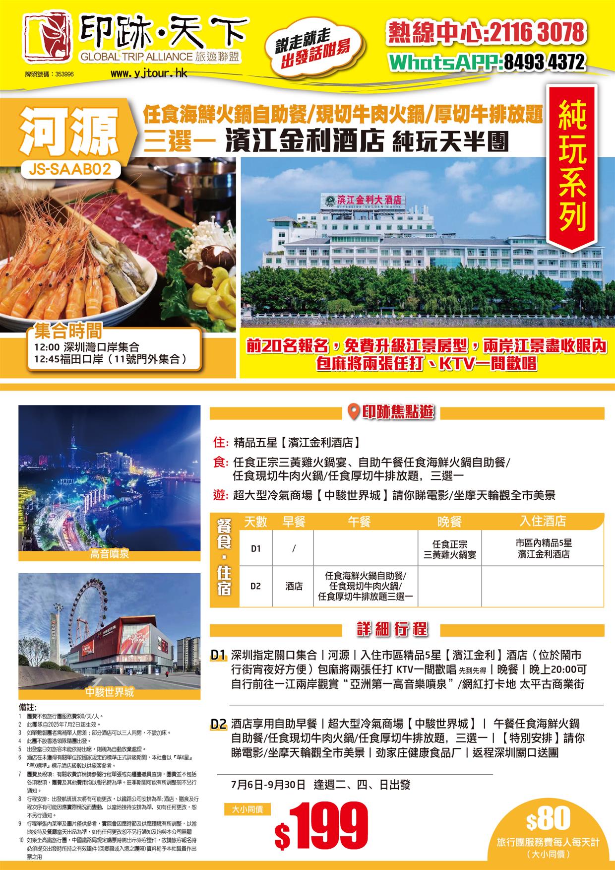 河源(中午出發)任食正宗三黃雞火鍋宴 自助午餐三選一 入住市區精品五星濱江金利酒店純玩天半團