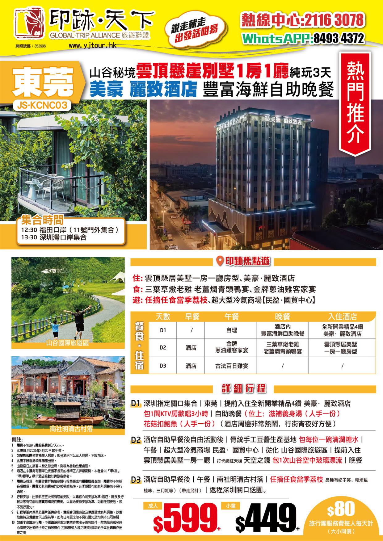 中午出發東莞 雲頂懸崖別墅一房一廳 全新美豪麗致酒店 豐富海鮮自助晚餐 任摘任食當季荔枝 純玩3日