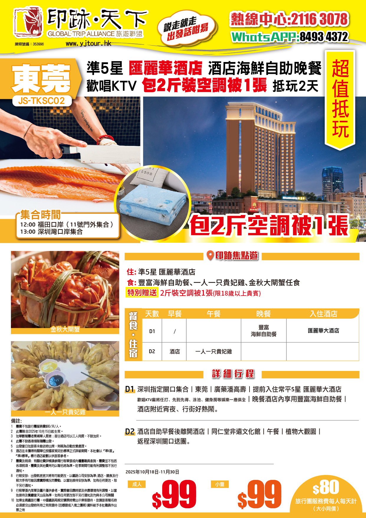 (中午出發) 東莞常平【匯麗華酒店】包兩斤裝空調被一張 酒店內【豐富海鮮自助餐】抵玩2天