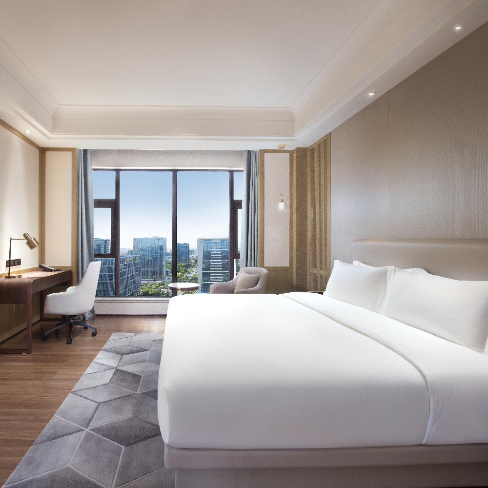酒店擁有別具特色嘅客房兩百餘間(套),房間面積為45-90㎡唔等,闊落舒適。 現代簡約嘅新中式設計風格,精緻瑰麗、舒適典雅。