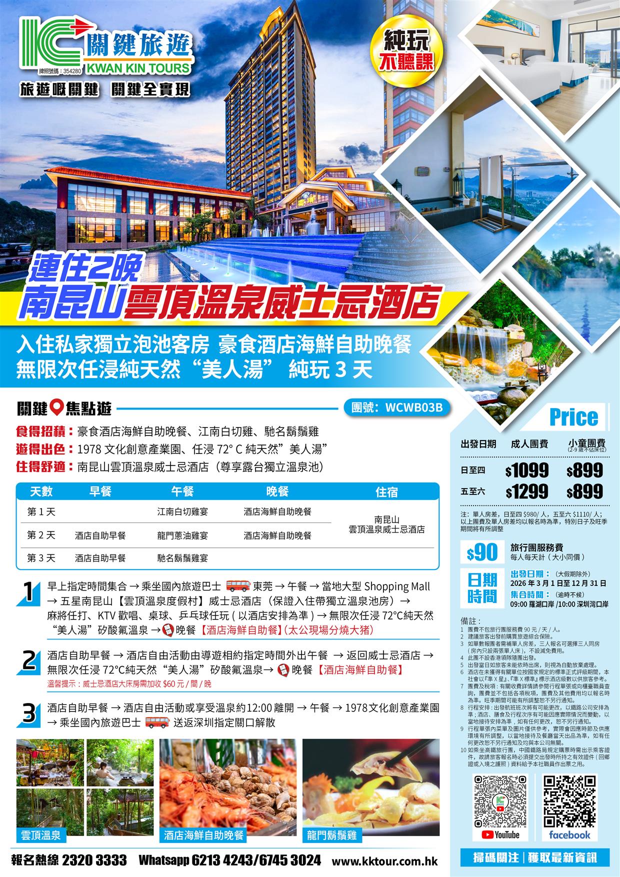 B線-連住2晚南昆山【雲頂溫泉威士忌酒店】 入住私家獨立泡池客房 酒店海鮮自助晚餐 純玩3天