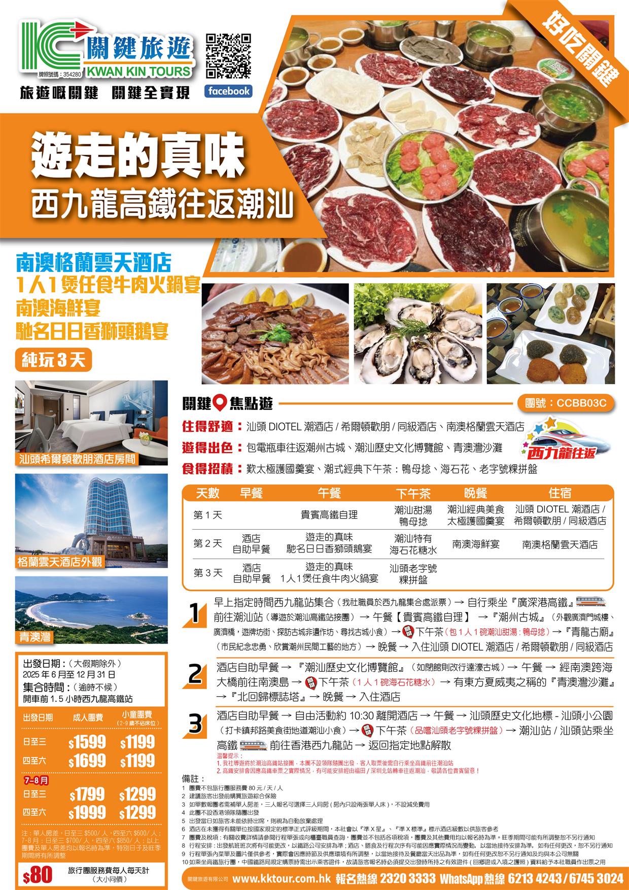 C線-西九龍高鐵往返潮汕 汕頭希爾頓歡朋酒店/DIOTEL 潮酒店+南澳格蘭雲天酒店 美食純玩3天