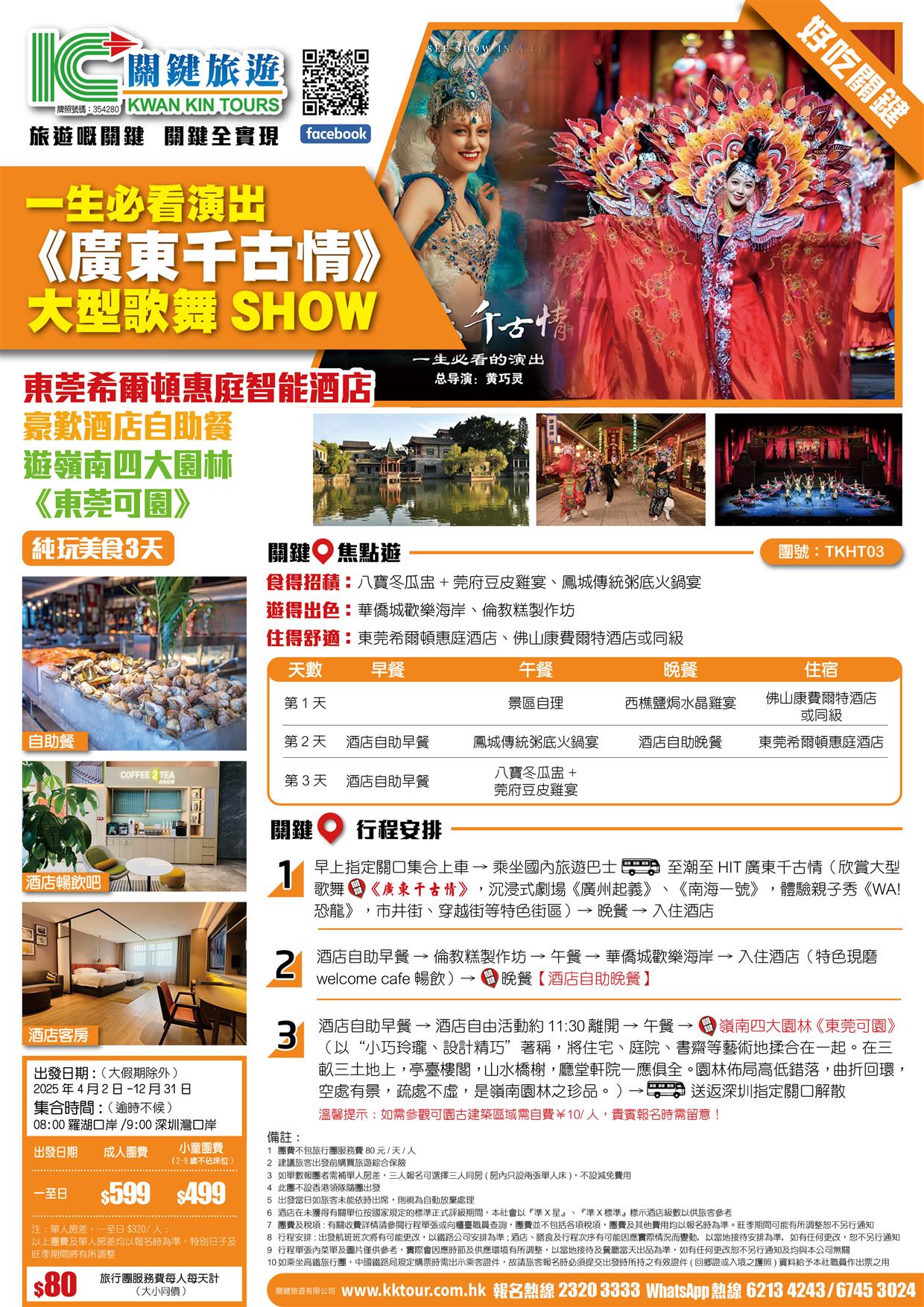 東莞希爾頓惠庭智能酒店 豪歎酒店自助餐 一生必看演出--《廣東千古情》大型歌舞SHOW純玩美食3天