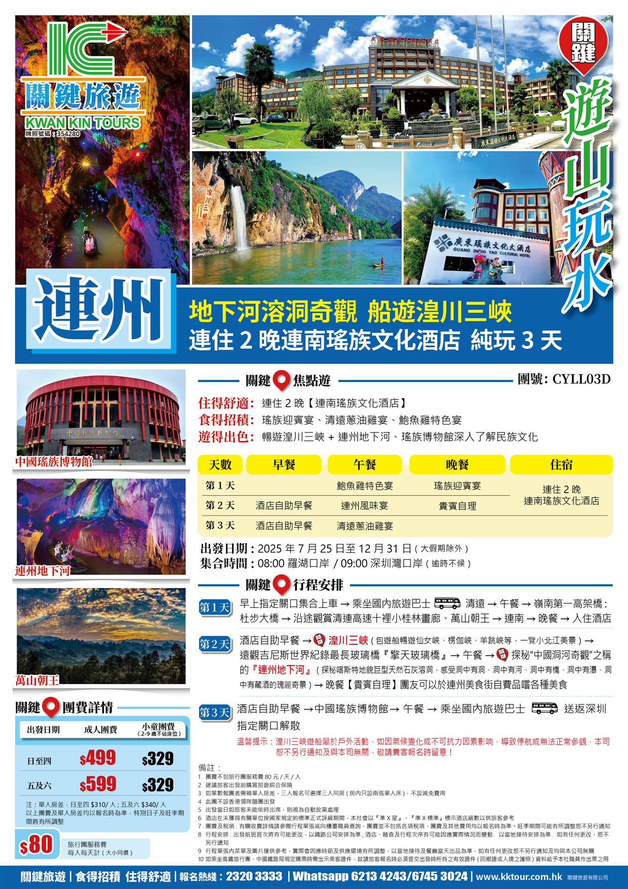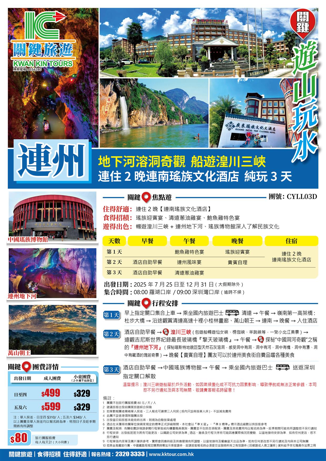 D線-連州地下河溶洞奇觀 船遊湟川三峽 連住2晚連南瑤族文化酒店 純玩3天