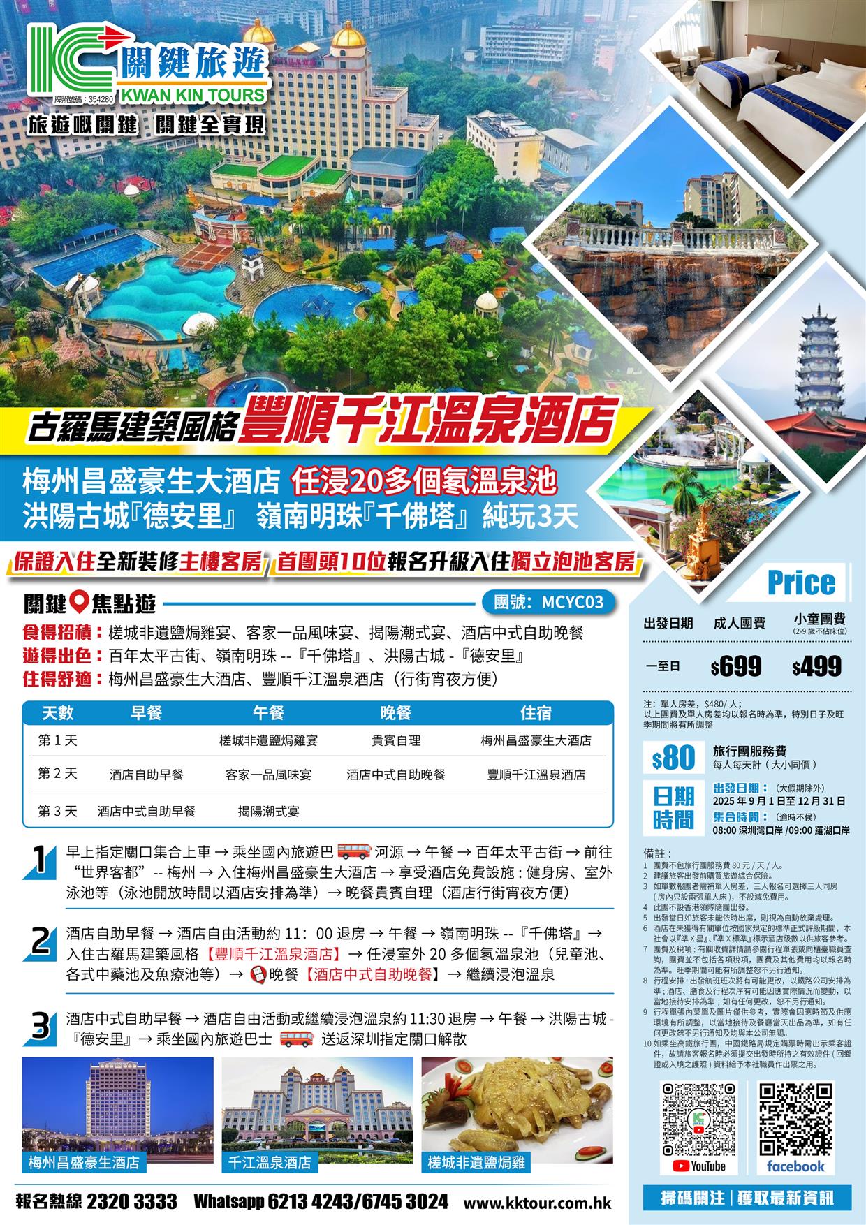 梅州昌盛豪生大酒店 +古羅馬建築風格【豐順千江溫泉酒店】任浸20多個氡溫泉池 德安里 千佛塔純玩3天