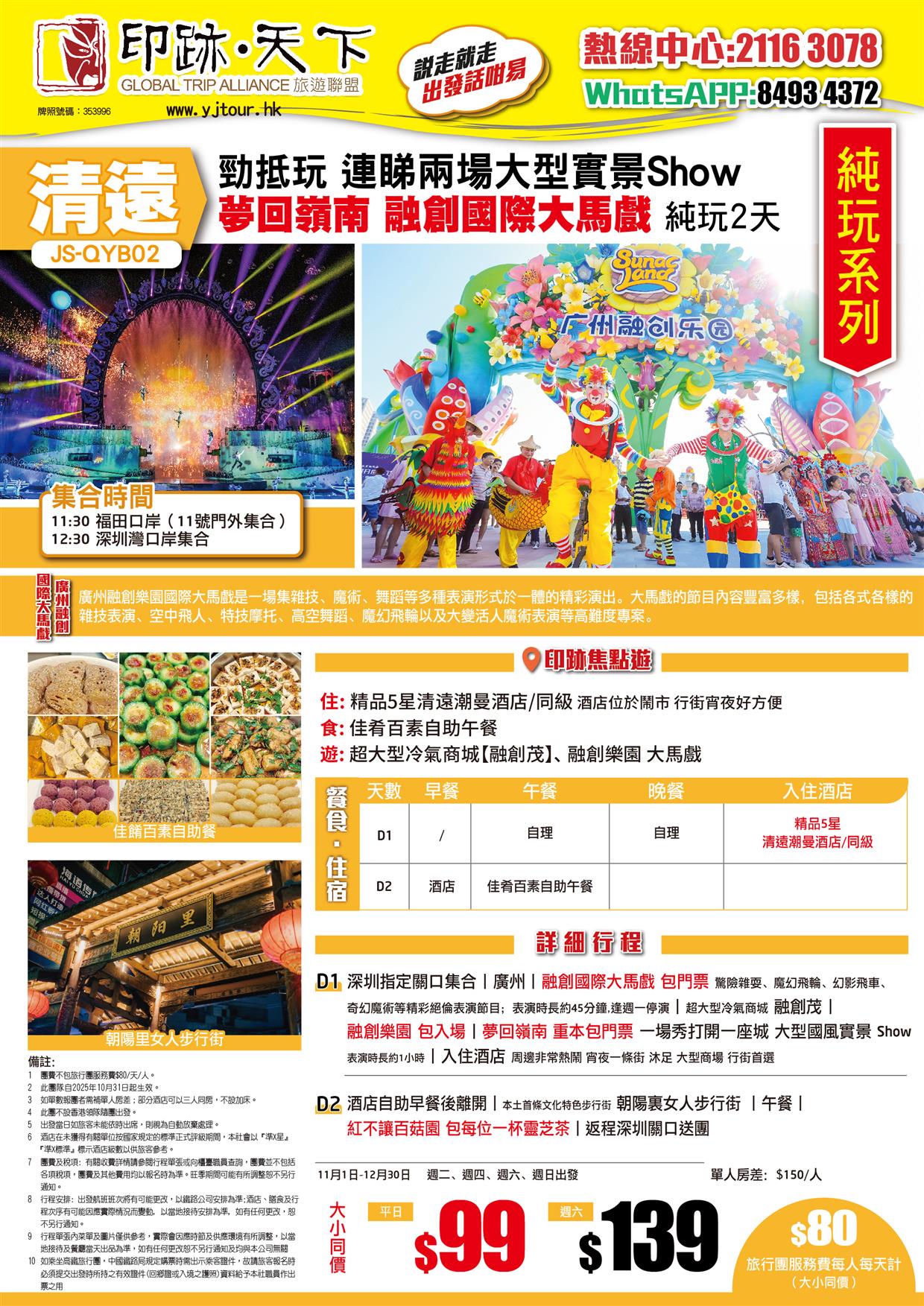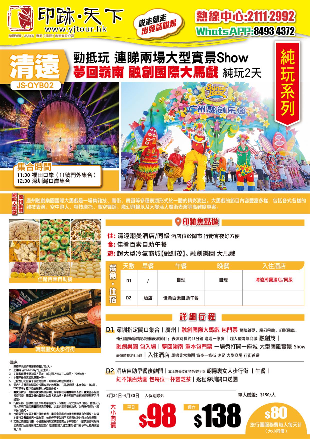 中午出發 清遠 勁抵玩-連睇兩場大型Show【夢回嶺南】【融創國際大馬戲】 美食純玩2天
