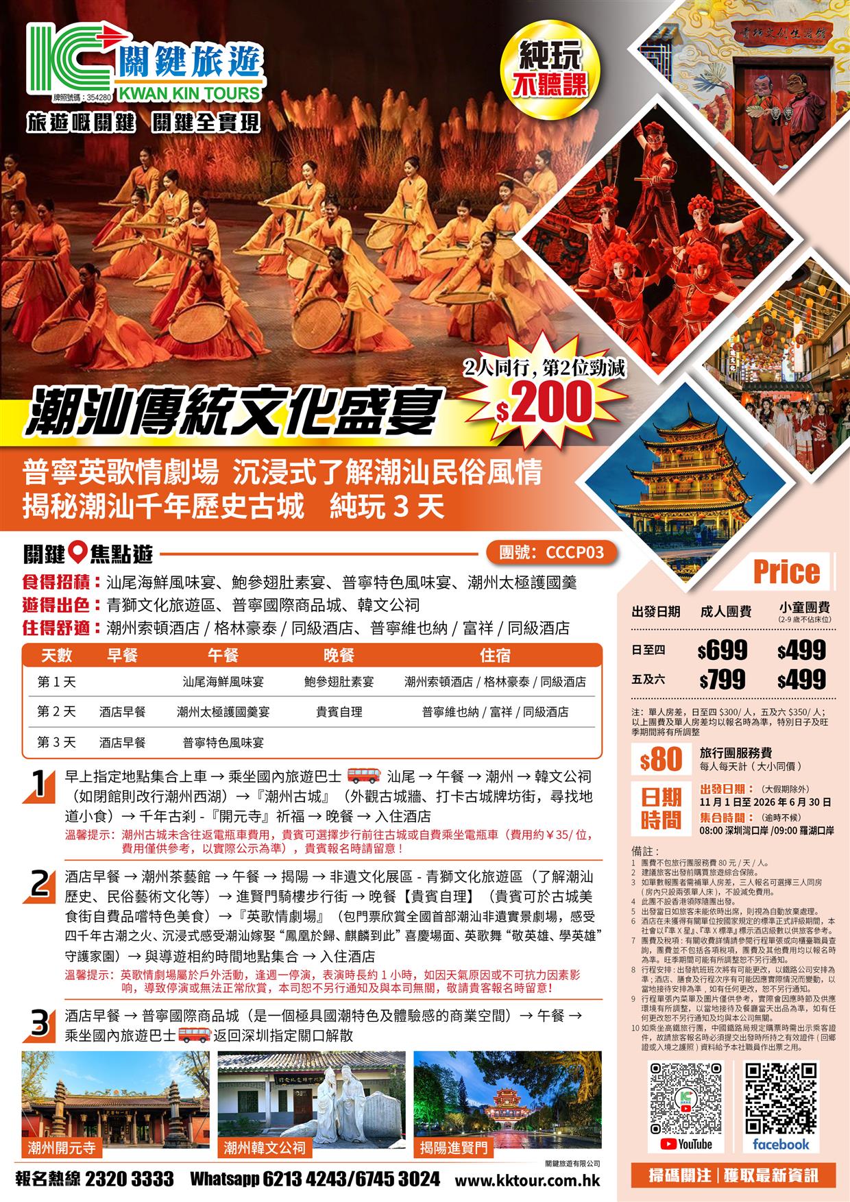 (2人同行第2位-200)潮汕文化盛宴 普寧英歌情劇場 沉浸式了解潮汕民俗風情 純玩3天