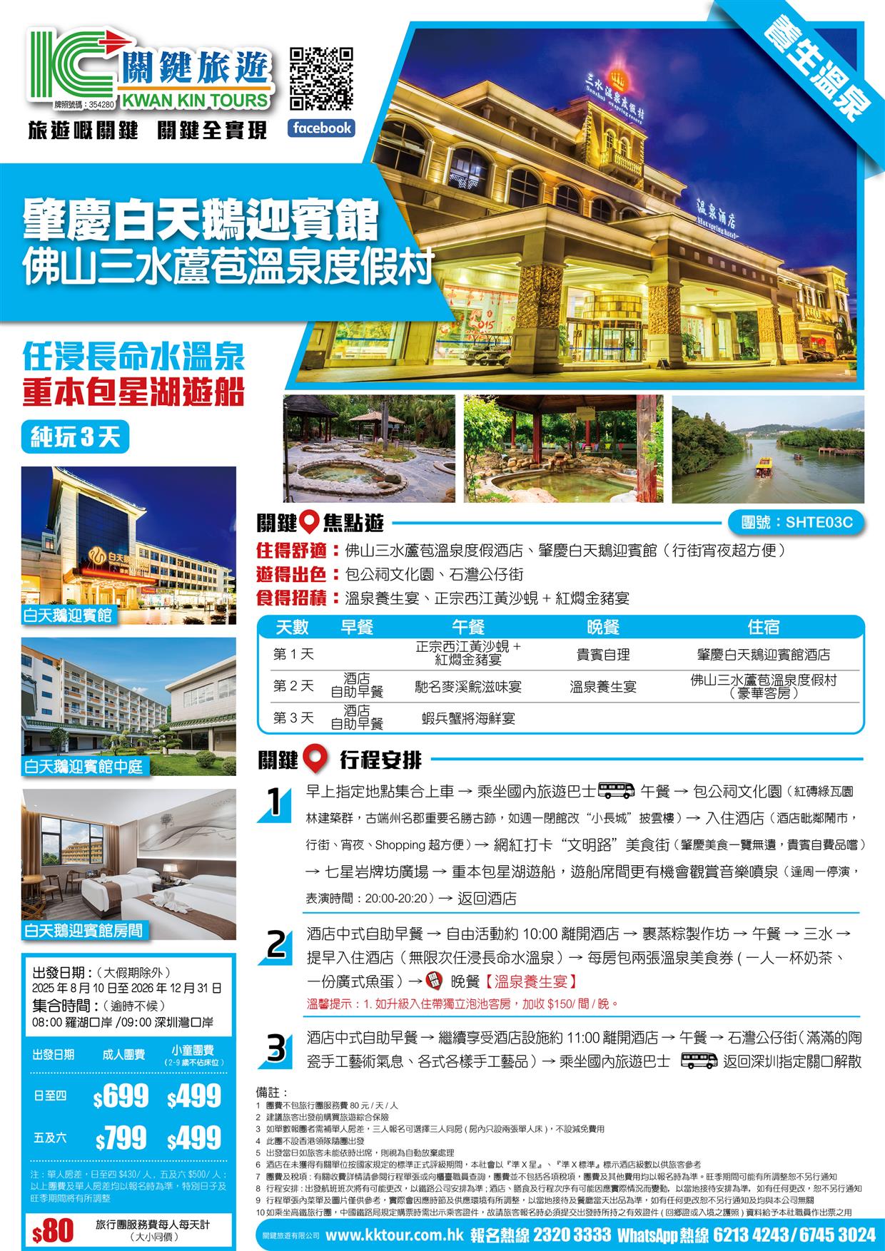 C線-佛山三水蘆苞溫泉度假村 任浸長命水溫泉 肇慶白天鵝迎賓館 重本包星湖遊船 純玩3天