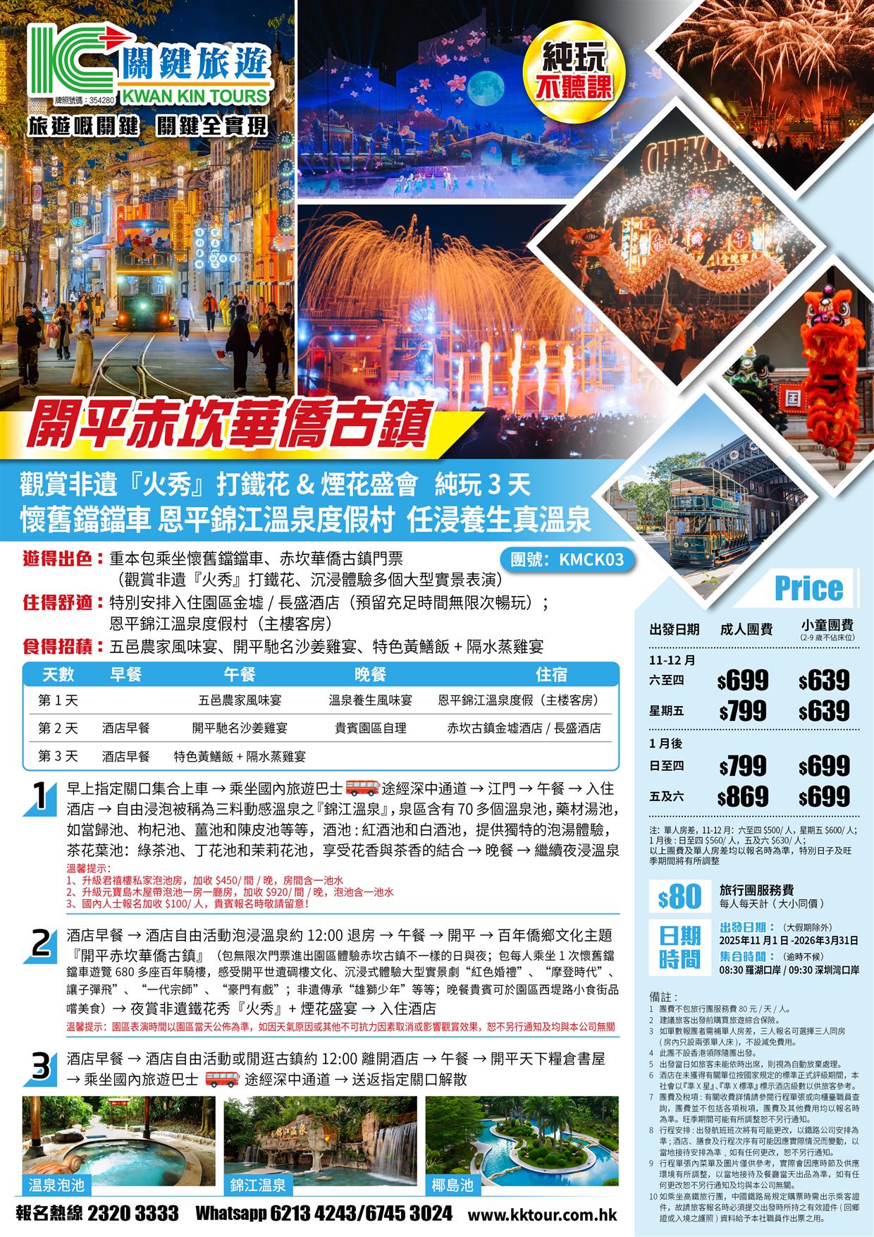 開平赤坎華僑古鎮(入住園區酒店、懷舊鐺鐺車)、恩平錦江溫泉度假村 任浸三料『動感溫泉』純玩3天