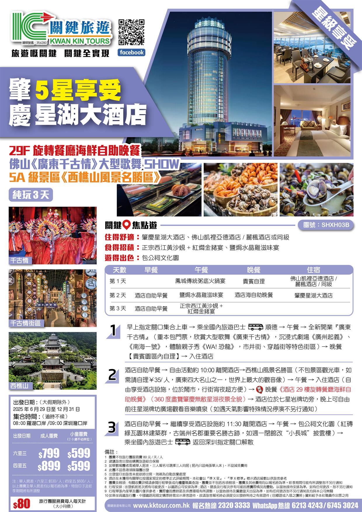 B線-肇慶星湖大酒店 29F旋轉餐廳海鮮自助晚餐 佛山《廣東千古情》+ 西樵山 純玩3天