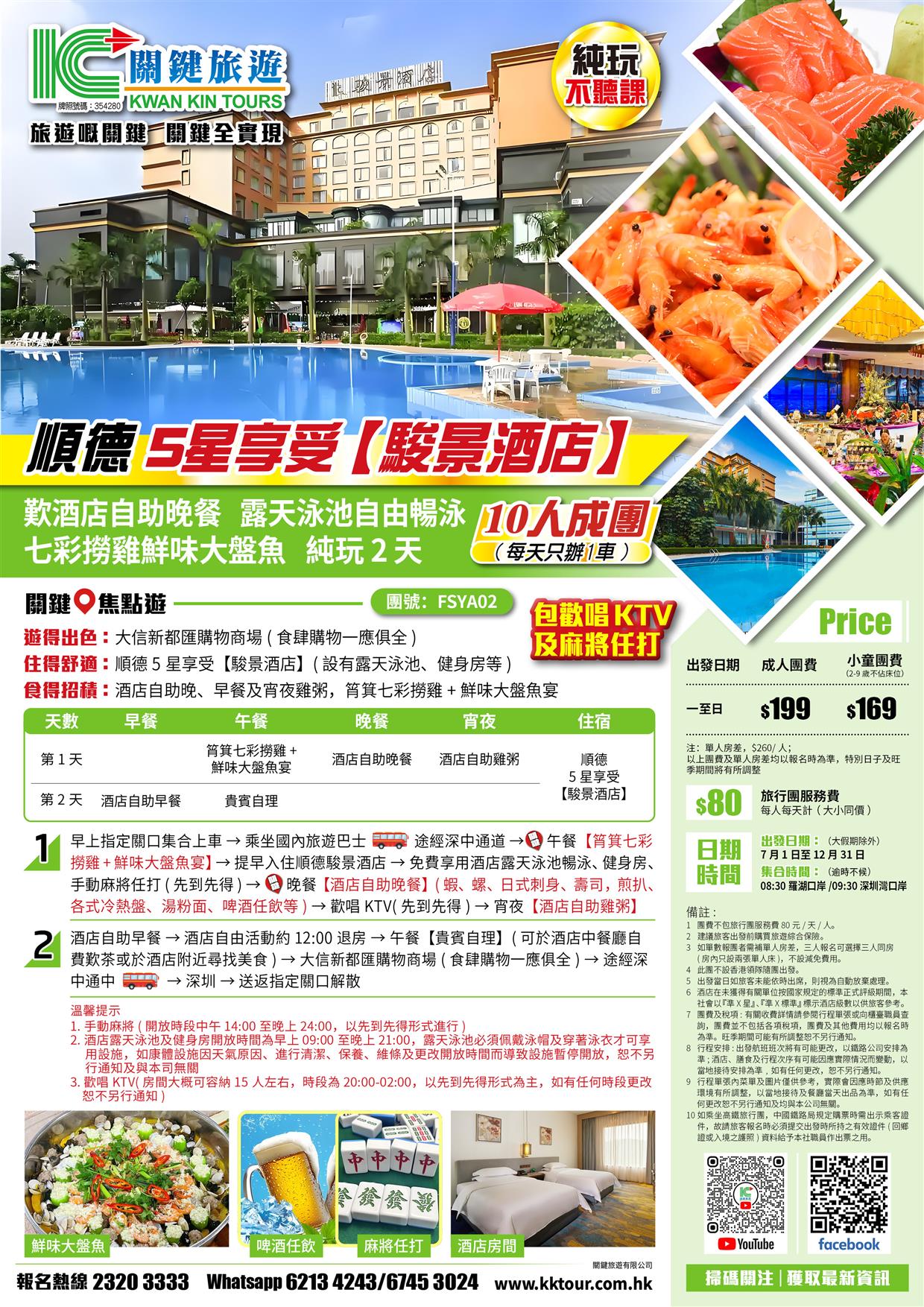 (10人成團)順德5星享受【駿景酒店】、酒店自助晚餐、七彩撈雞鮮味大盤魚純玩2天