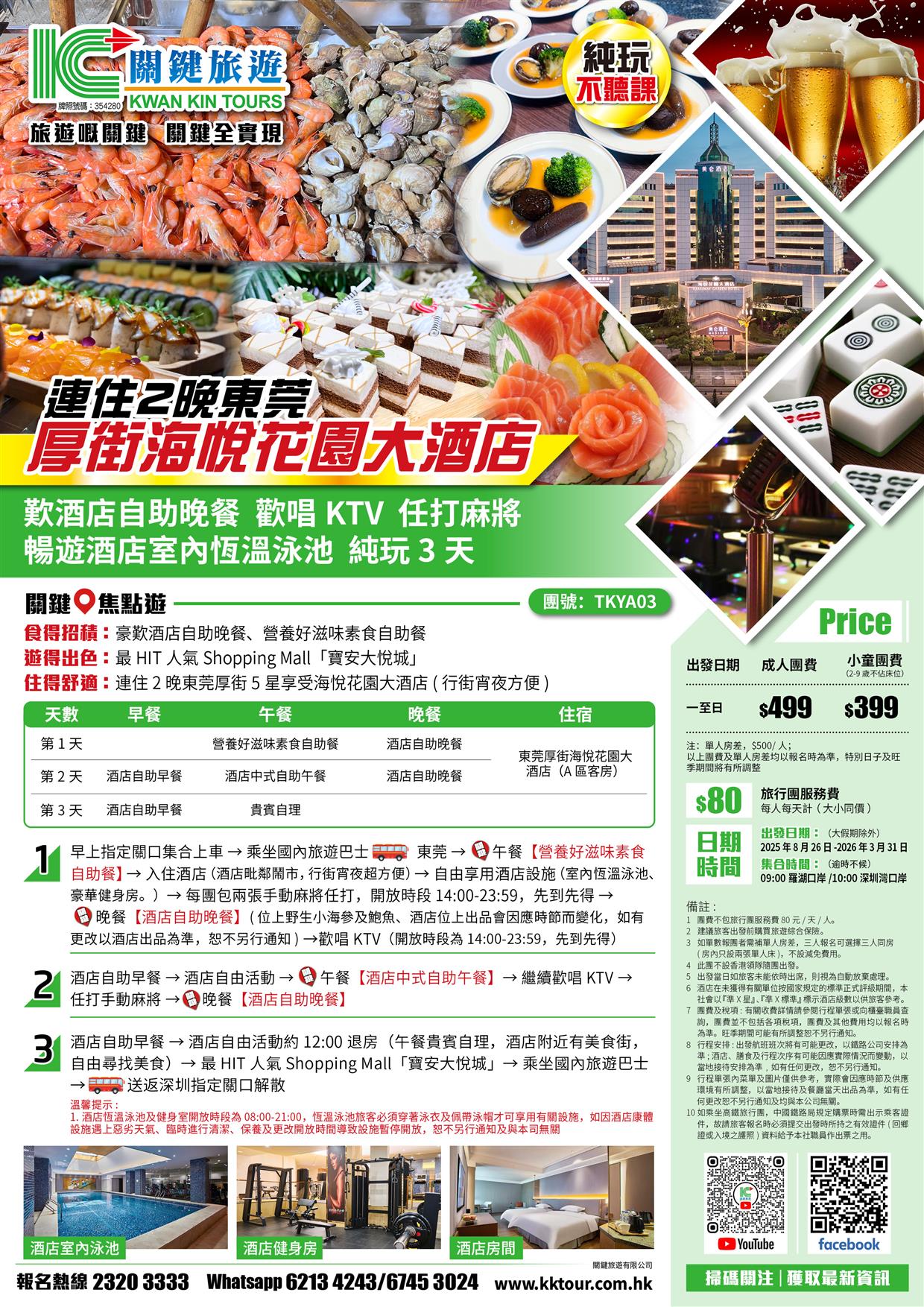 連住2晚東莞厚街海悅花園大酒店 歡唱KTV 任打麻將 酒店自助晚餐純玩3天