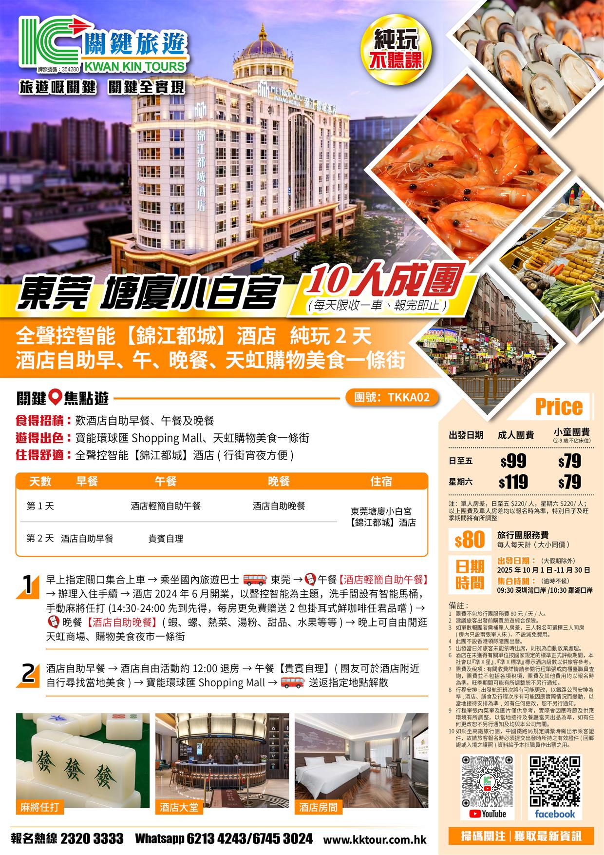 (10人成團)東莞塘廈小白宮~全聲控智能【錦江都城】酒店(自助早、午、晚餐)純玩2天
