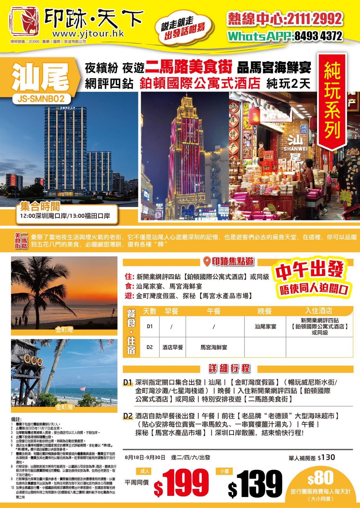 【夜繽紛】 汕尾 夜遊【二馬路美食街】 網評四鉆【鉑頓國際公寓式酒店】品馬宮海鮮宴 純玩2天