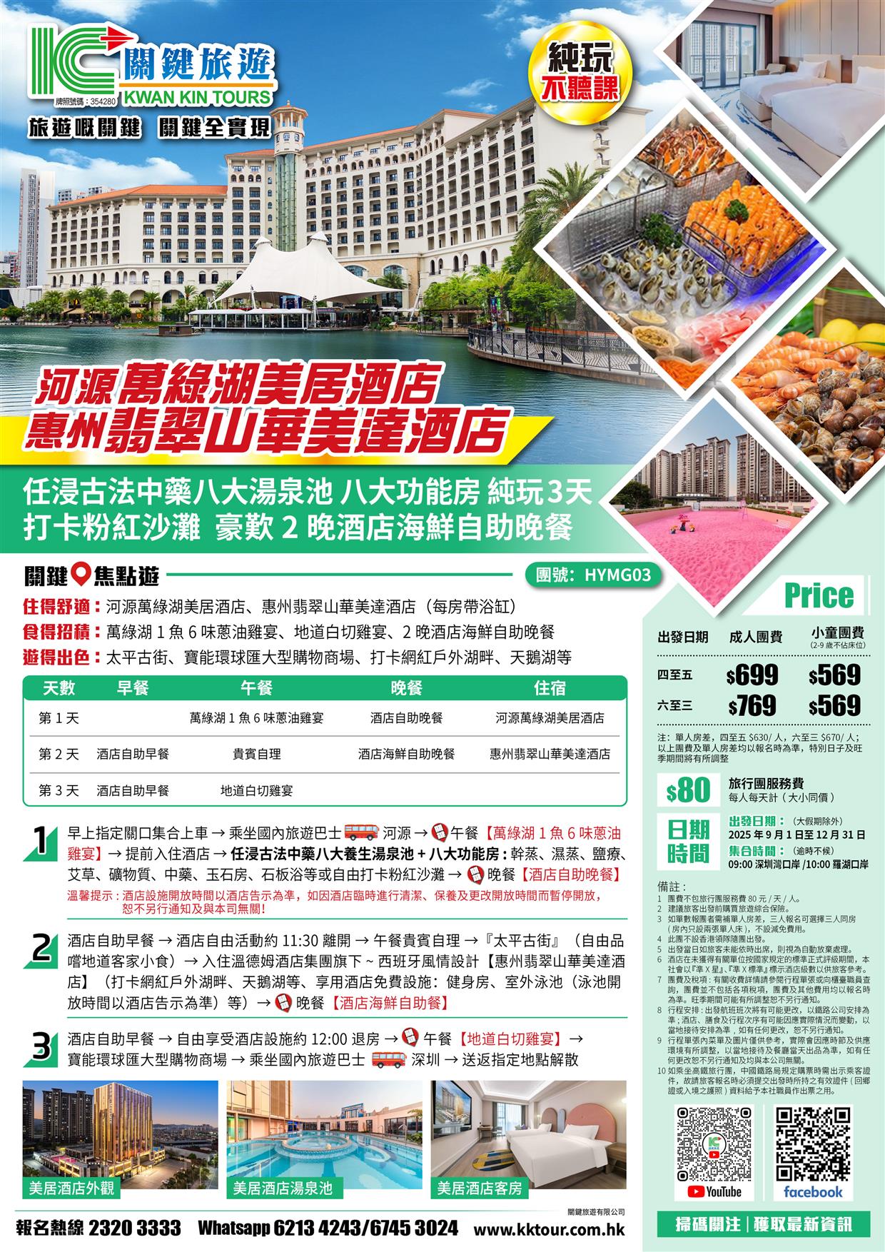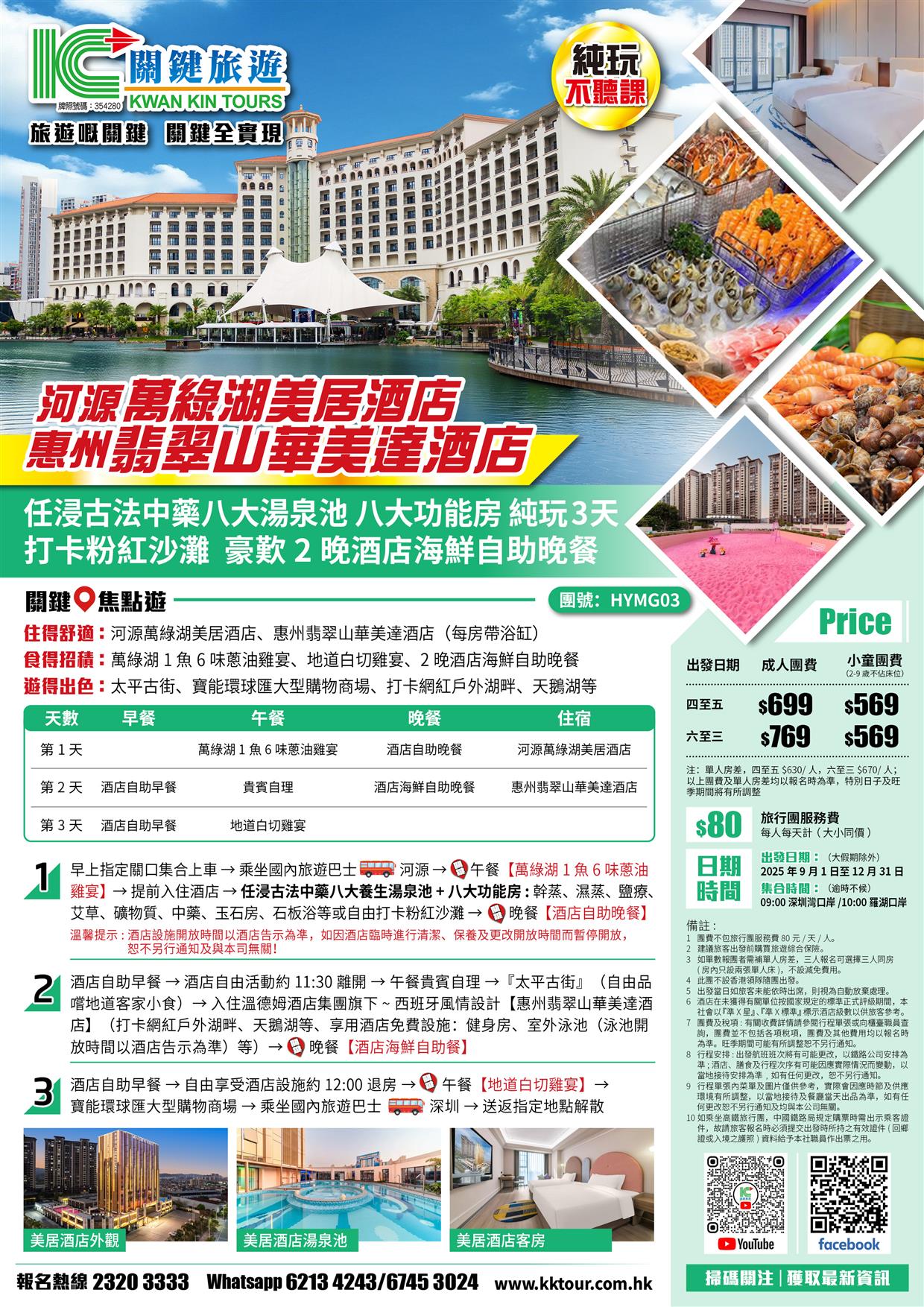 河源萬綠湖美居酒店+惠州翡翠山華美達酒店 豪歎2晚酒店海鮮自助晚餐 任浸古法中藥八大湯泉池 純玩3天