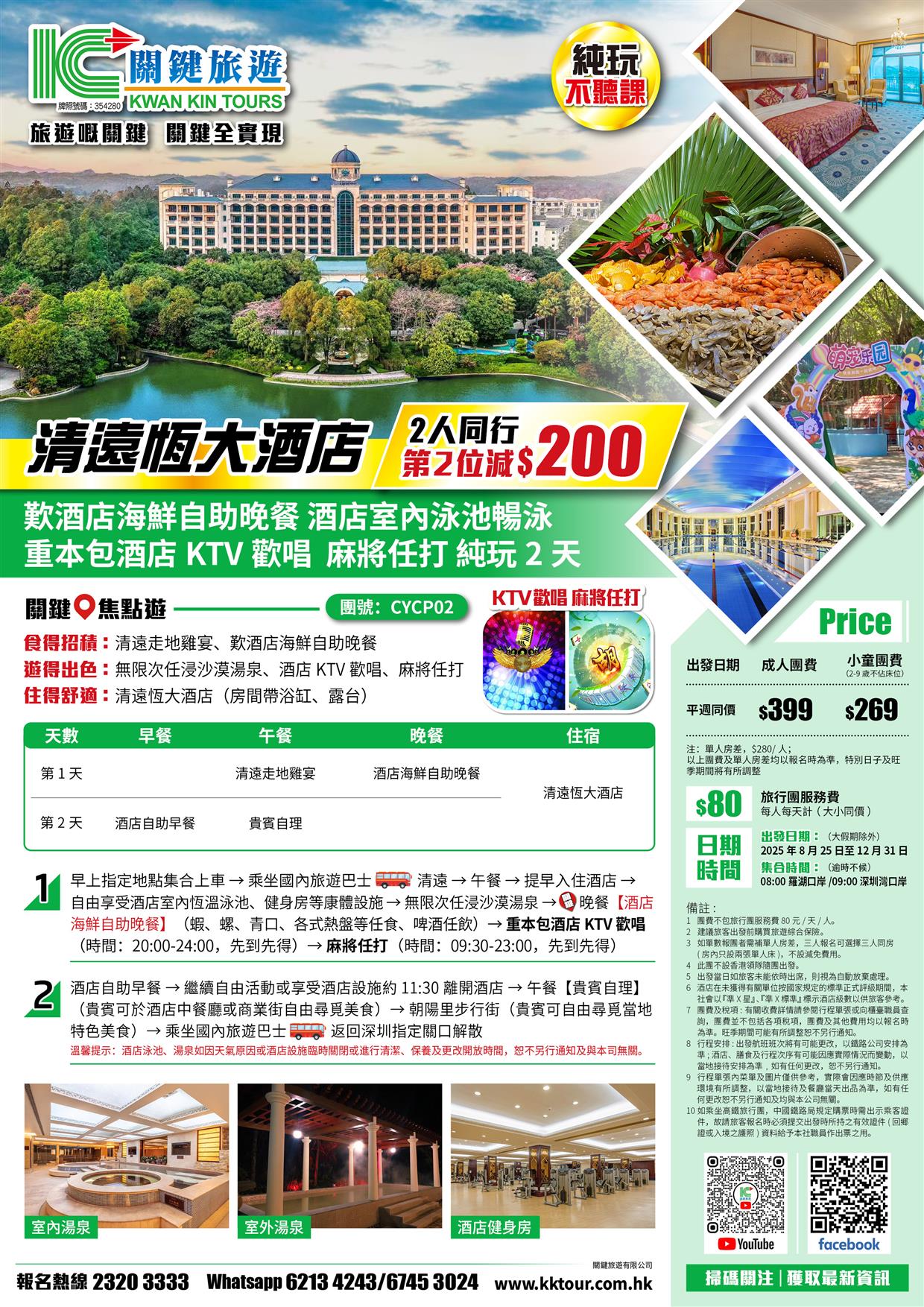 (2人同行第2位-200)清遠恆大酒店 歎酒店海鮮自助晚餐 包酒店KTV歡唱、麻將任打 純玩2天