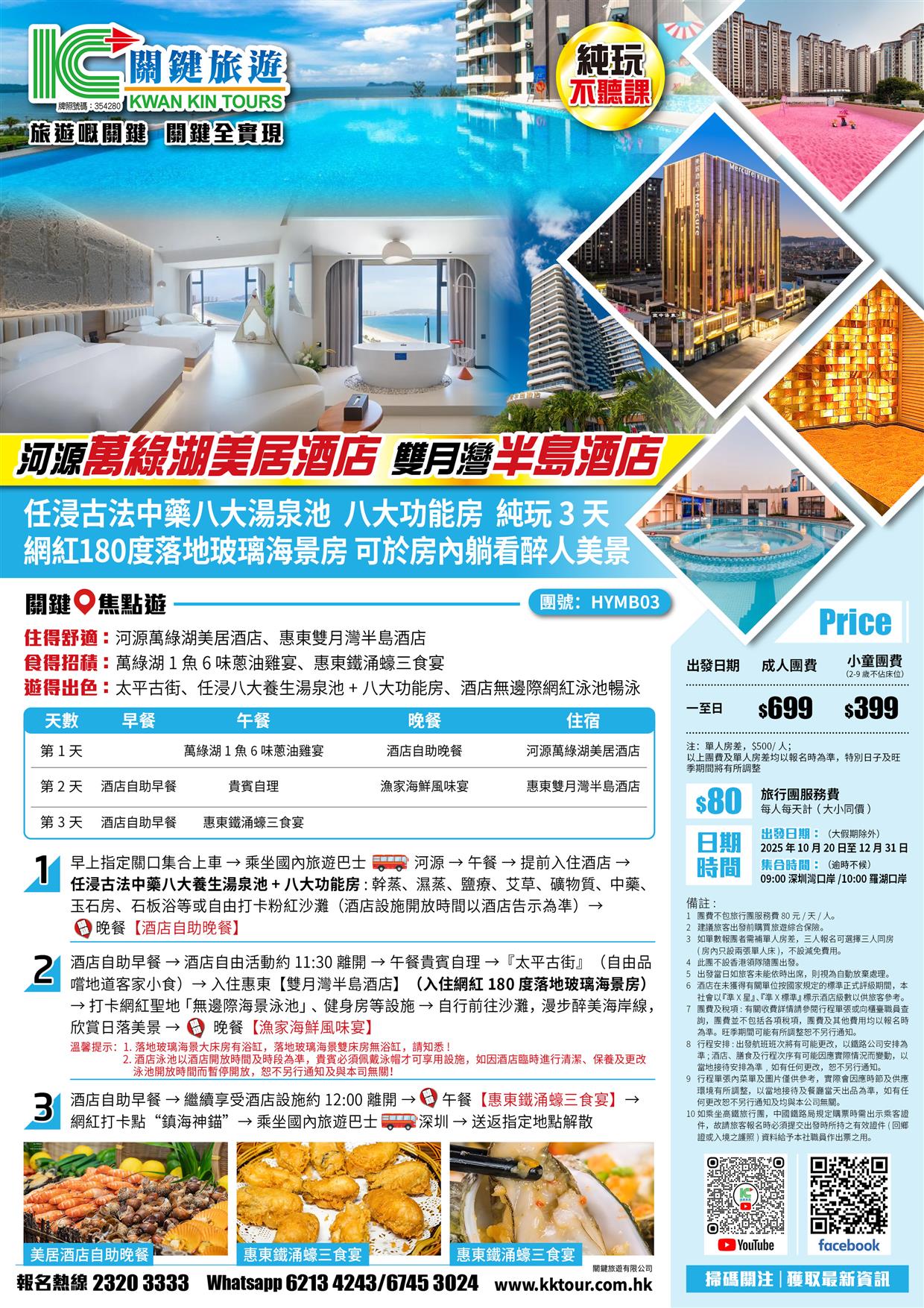 河源萬綠湖美居酒店(任浸古法中藥湯泉池)+雙月灣半島酒店(網紅180度落地玻璃海景房)純玩3天