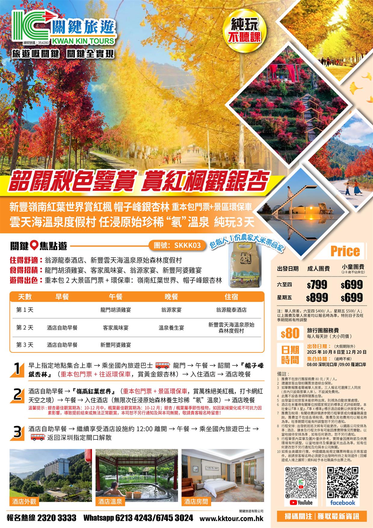 韶關新豐嶺南紅葉世界賞紅楓、帽子峰銀杏林 包門票+景區環保車 雲天海溫泉度假村 任浸溫泉純玩3天