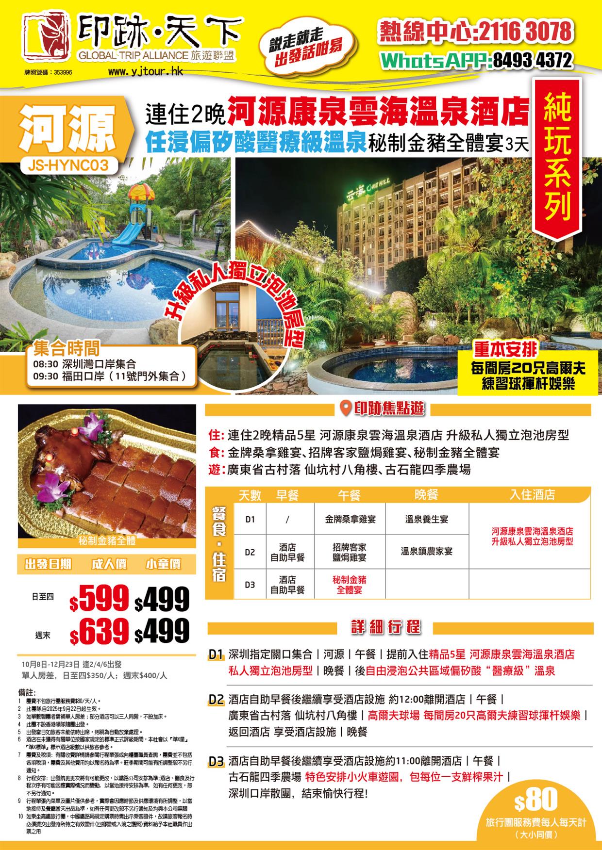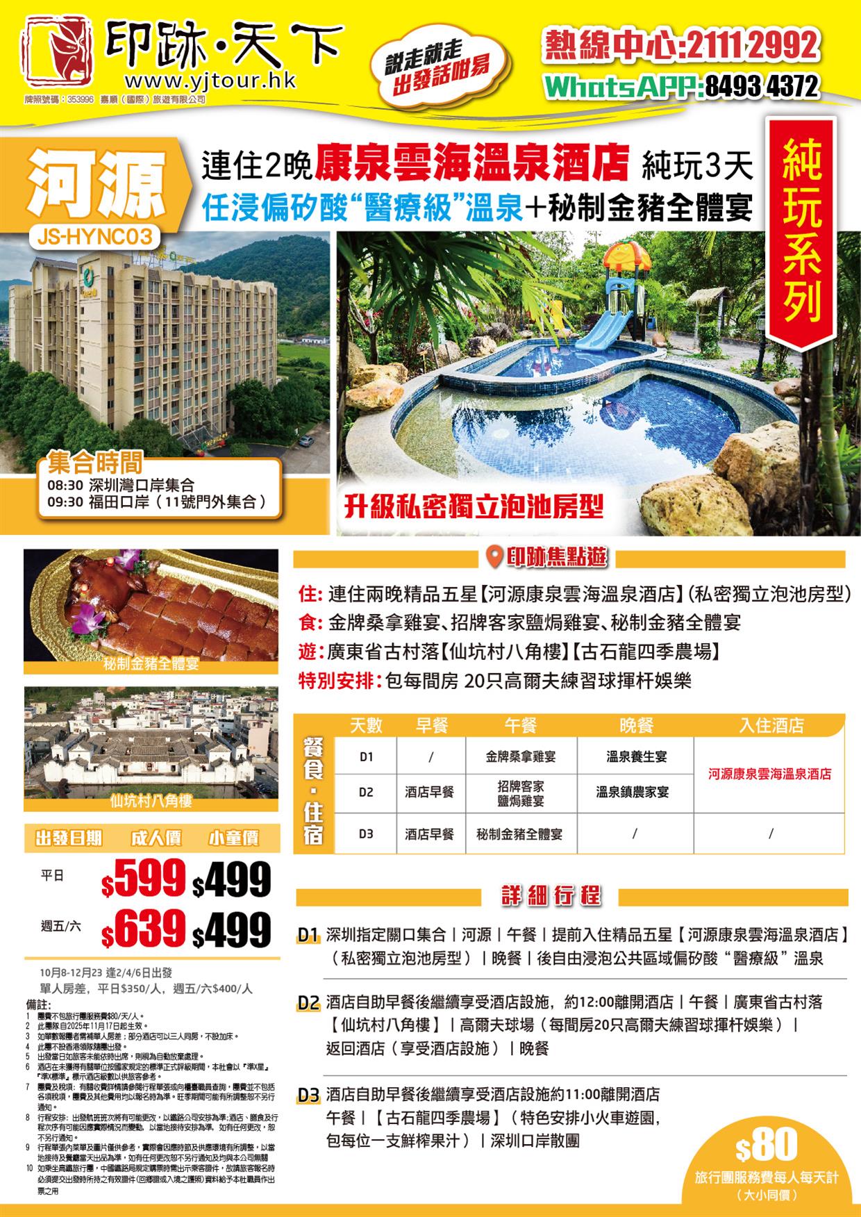 連住2晚 河源康泉雲海溫泉酒店 升級私密獨立泡池房型-任浸偏矽酸醫療級溫泉+秘制金豬全體宴 純玩3天
