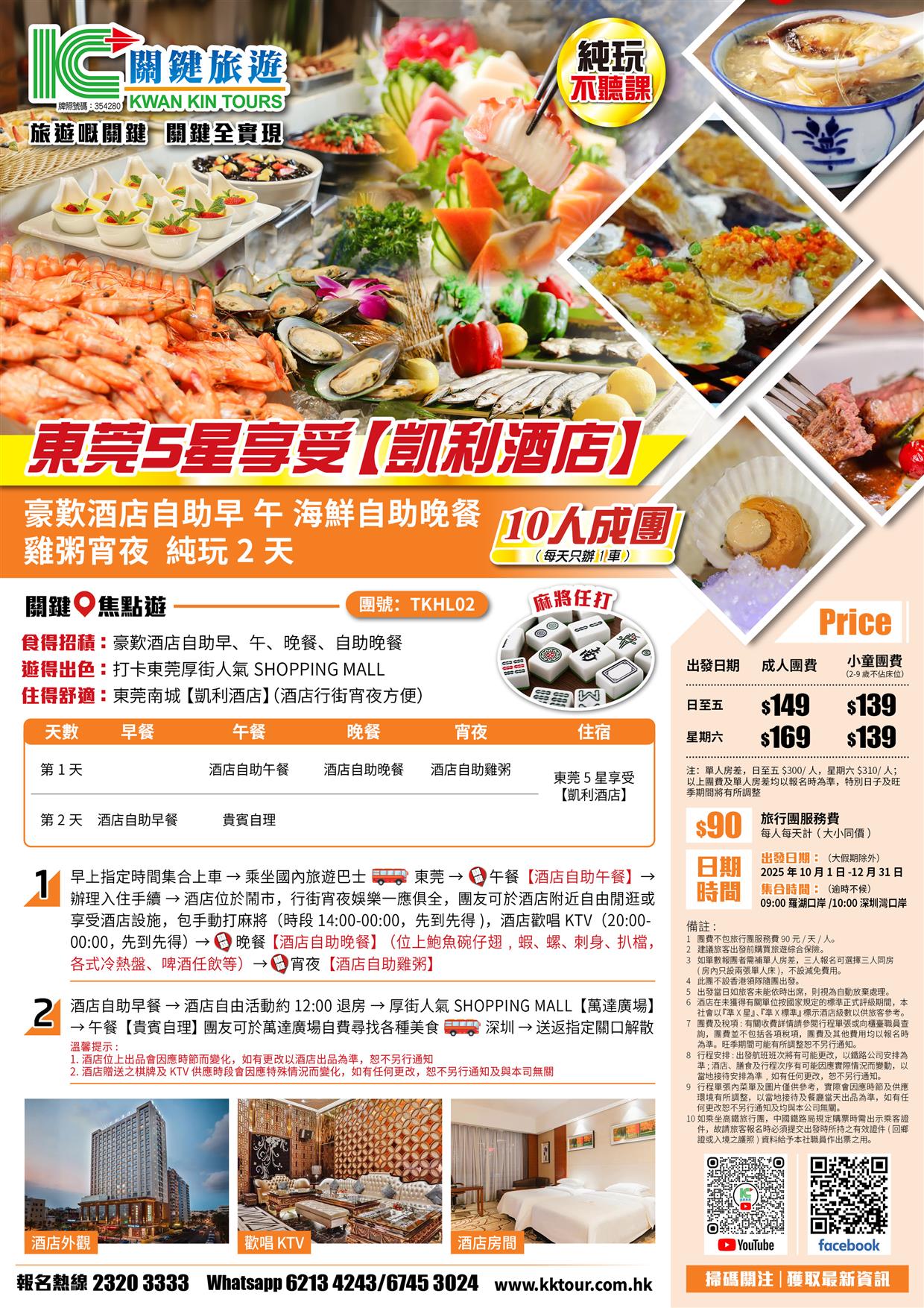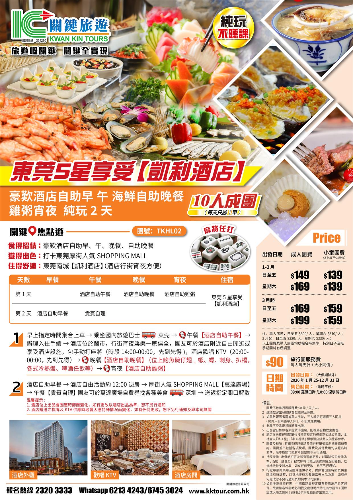 (10人成團)東莞5星享受【凱利酒店】 豪歎酒店自助早午晚餐 雞粥宵夜純玩2天