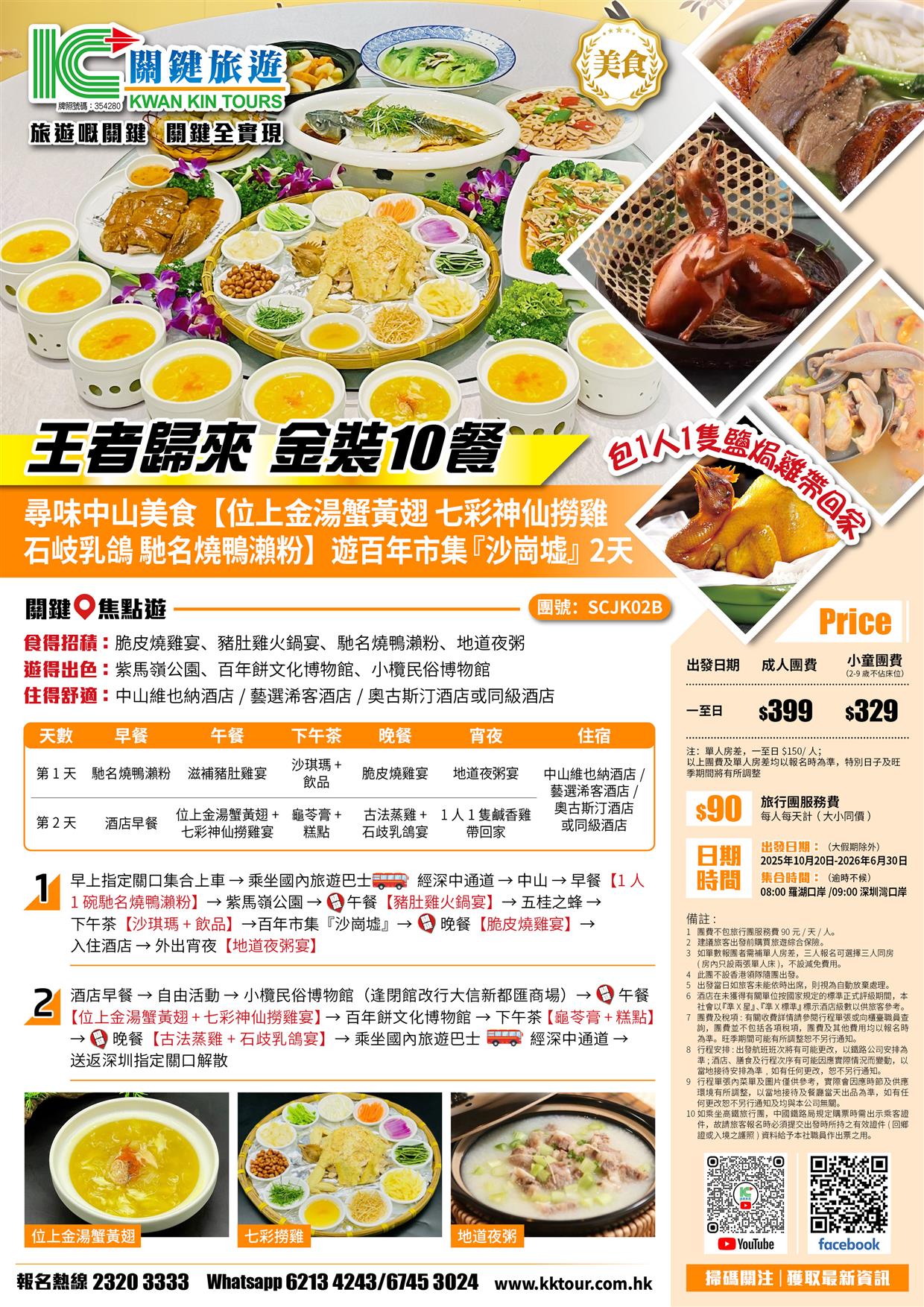 B線-尋味中山金裝10餐 遊百年市集『沙崗墟』 包1人1隻鹽焗雞帶回家2天