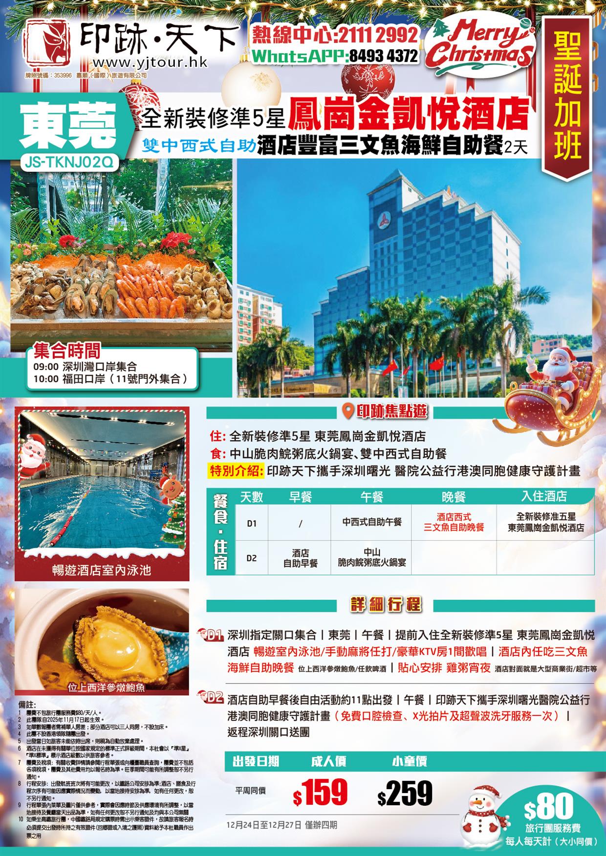 聖誕加班線 東莞 全新裝修准五星 東莞鳳崗金凱悅酒店 豐富三文魚海鮮自助晚餐 西式自助午餐 純玩2天