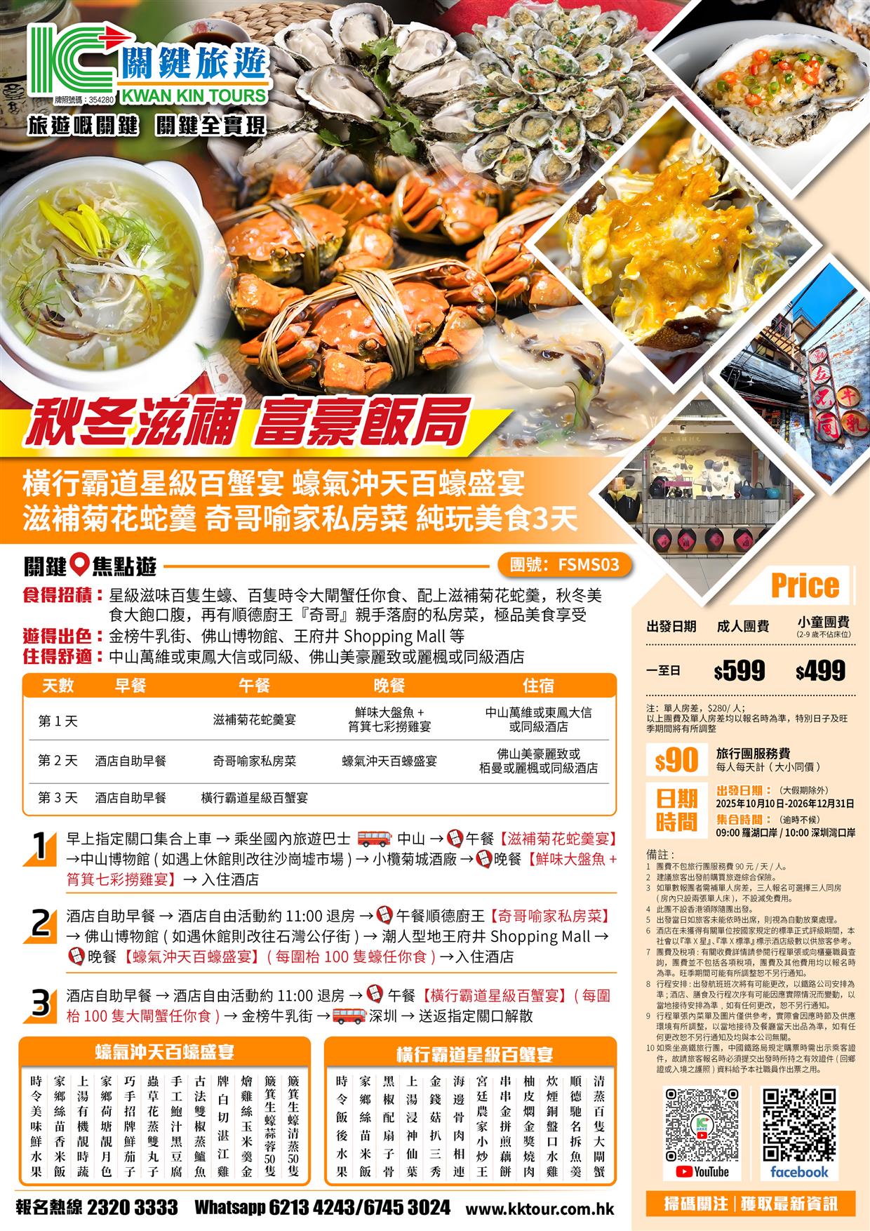 橫行霸道星級百蟹宴、蠔氣沖天百蠔盛宴、滋補菊花蛇羹、奇哥喻家私房菜純玩美食3天