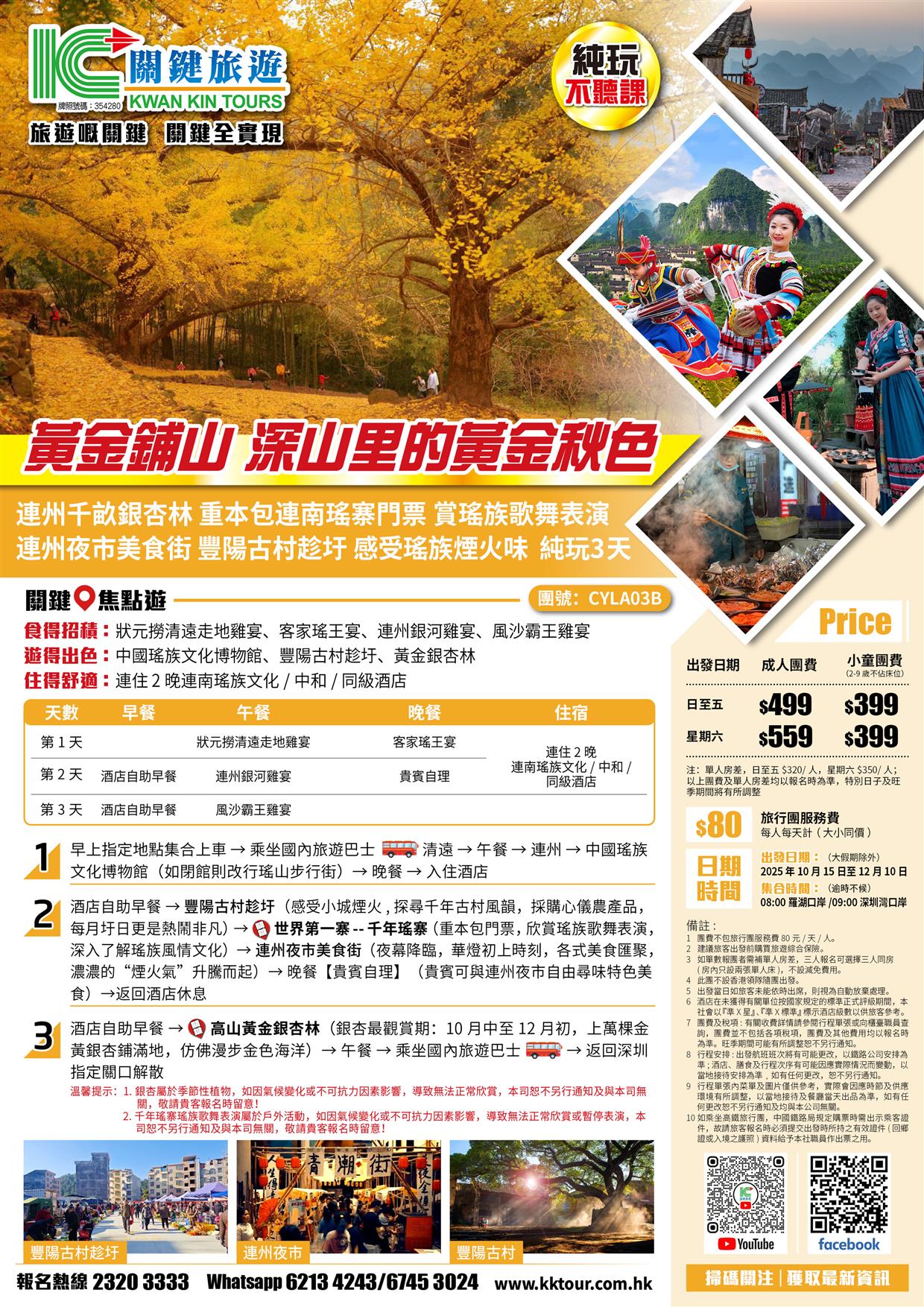 B線-深山里的黃金秋色 連州銀杏林 連南千年瑤寨 賞瑤族歌舞表演 連州夜市美食街 純玩3天