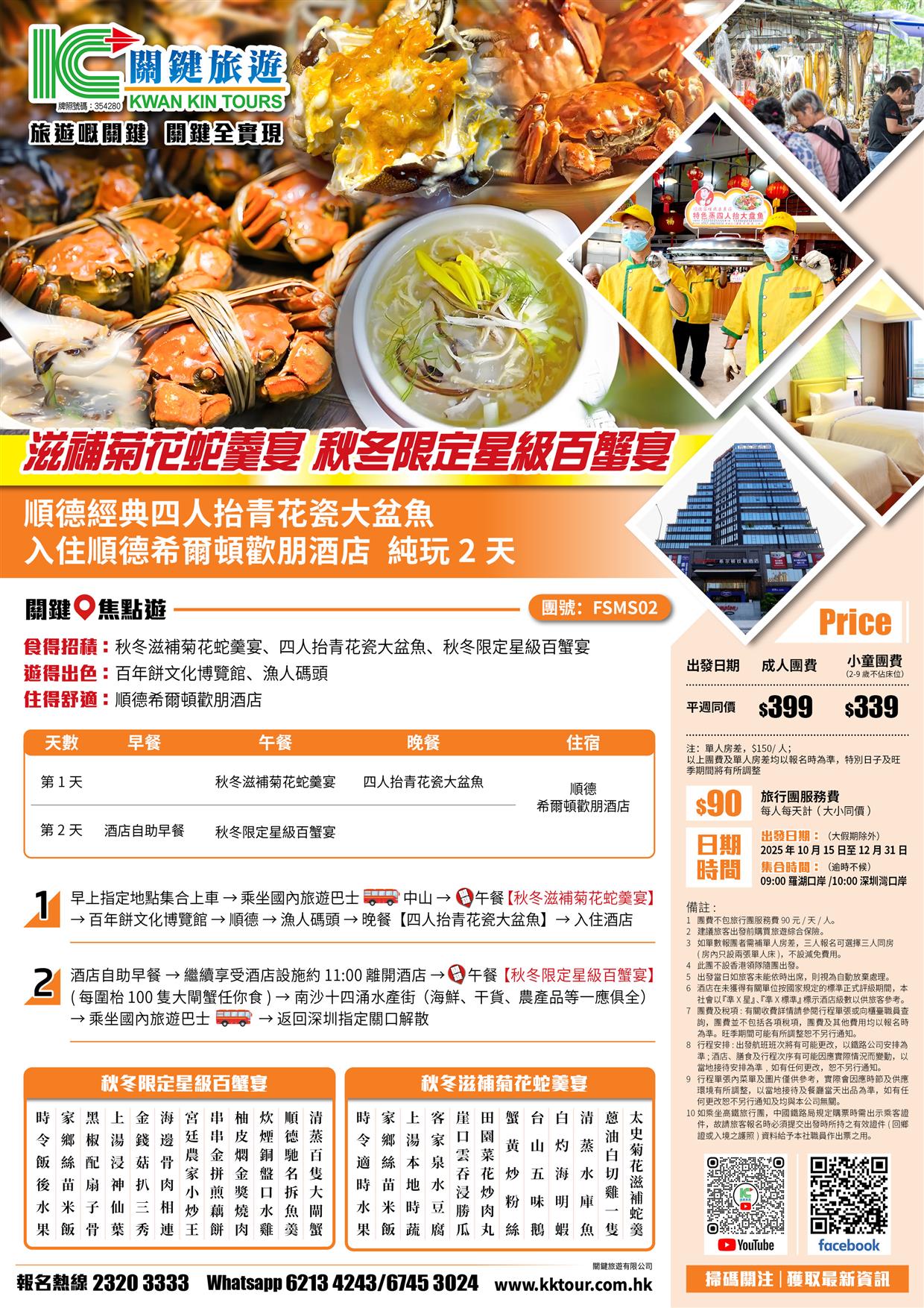 滋補菊花蛇羹宴、星級百蟹宴 四人抬青花瓷大盆魚 順德希爾頓歡朋酒店 中山順德美食純玩2天