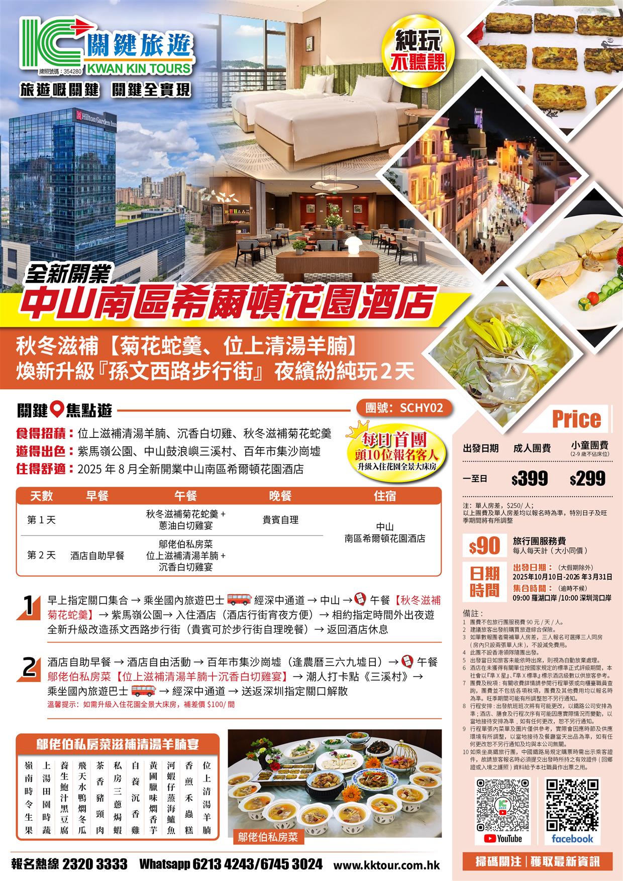 全新開業中山南區希爾頓花園酒店 秋冬滋補【菊花蛇羹、位上清湯羊腩】 孫文西路步行街夜繽紛純玩2天