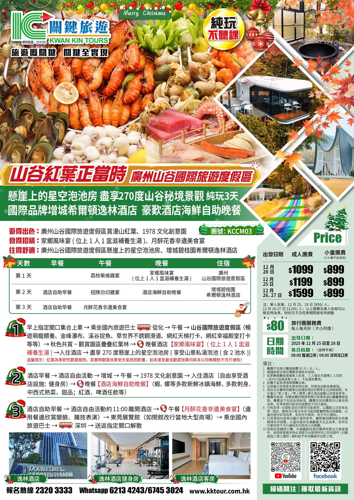 (聖誕加班)國際品牌增城希爾頓逸林酒店 歎酒店海鮮自助晚餐、廣州山谷國際旅遊度假區賞紅葉純玩3天