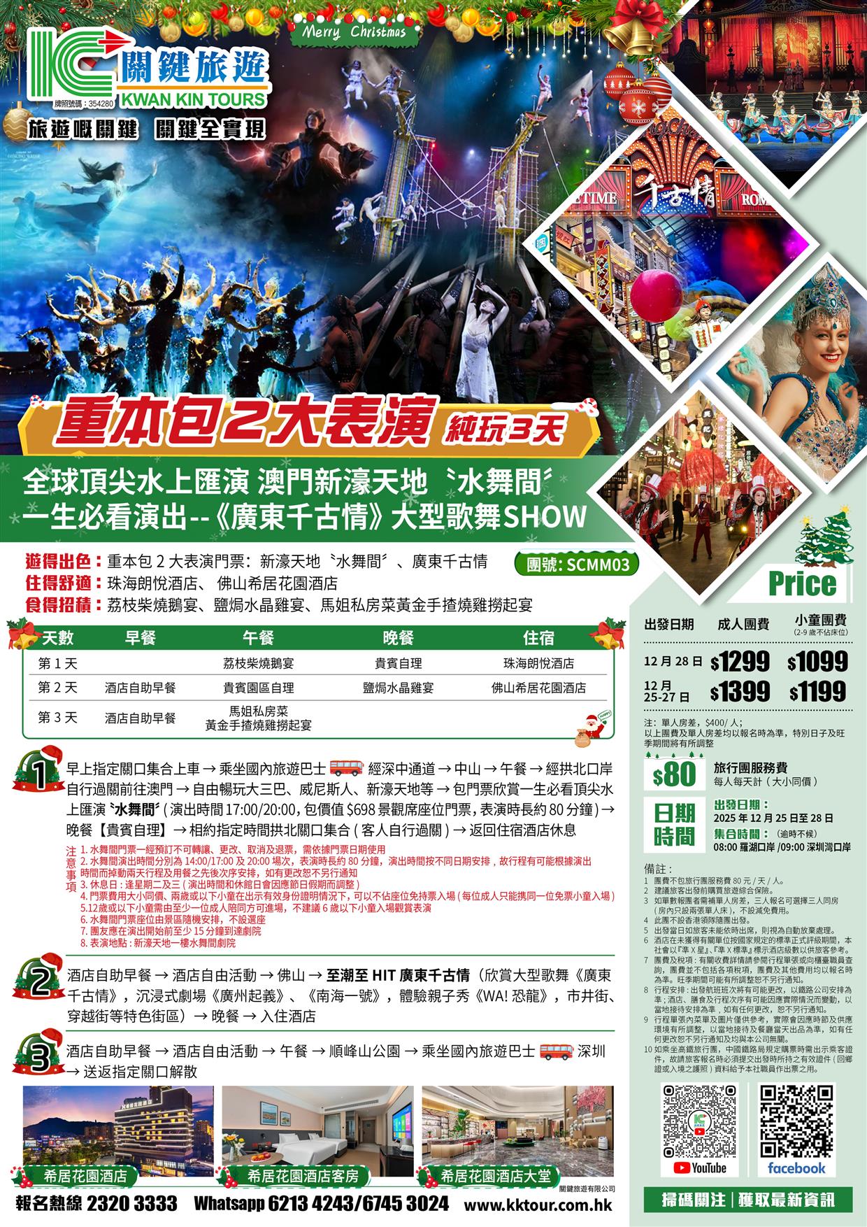 (聖誕加班)澳門新濠天地水舞間、廣東千古情大型歌舞SHOW 重本包2大表演純玩3天