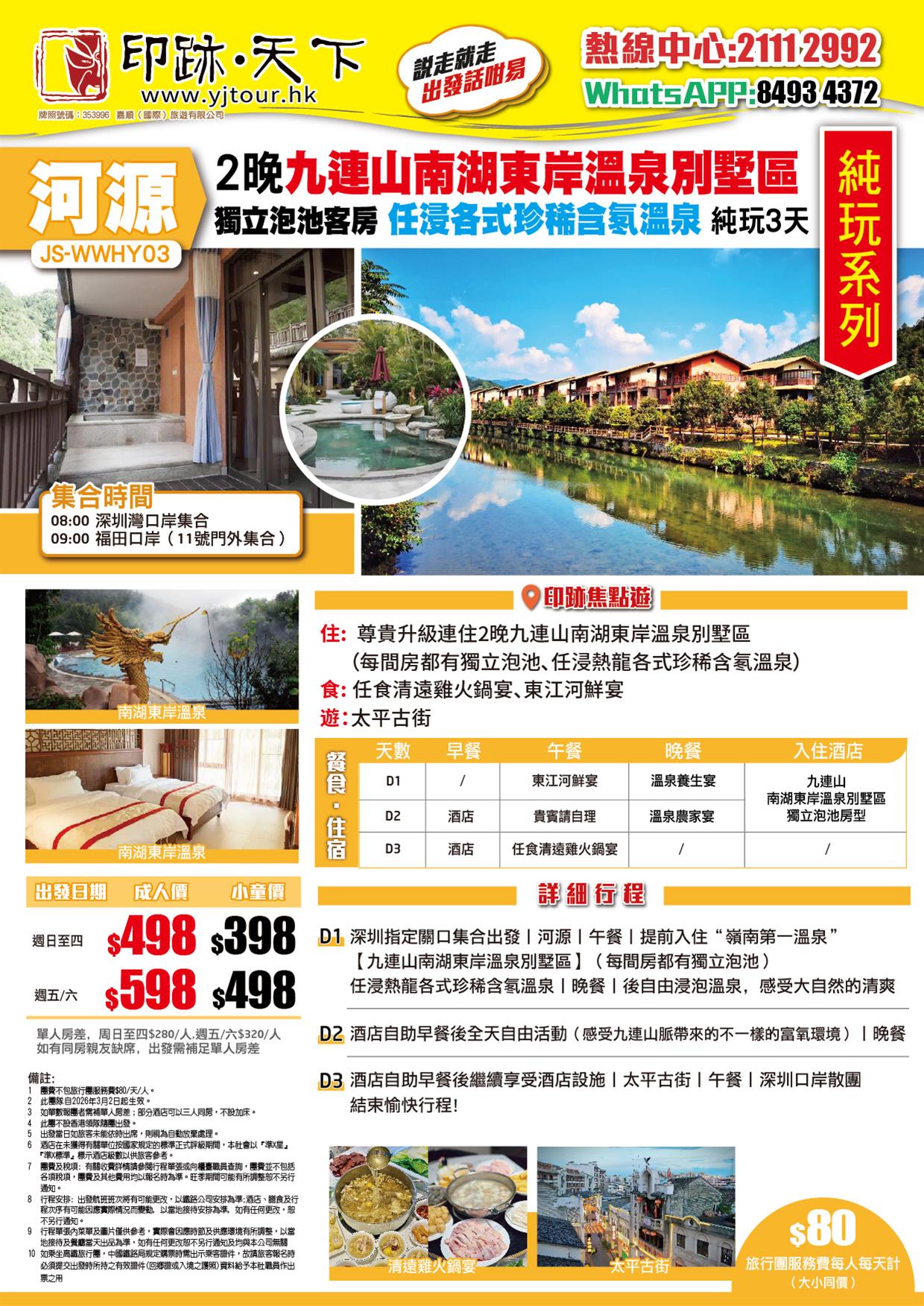 純玩 升級回歸連住兩晚九連山南湖東岸溫泉別墅區(每間房都有獨立泡池)任浸各式珍稀溫泉3天