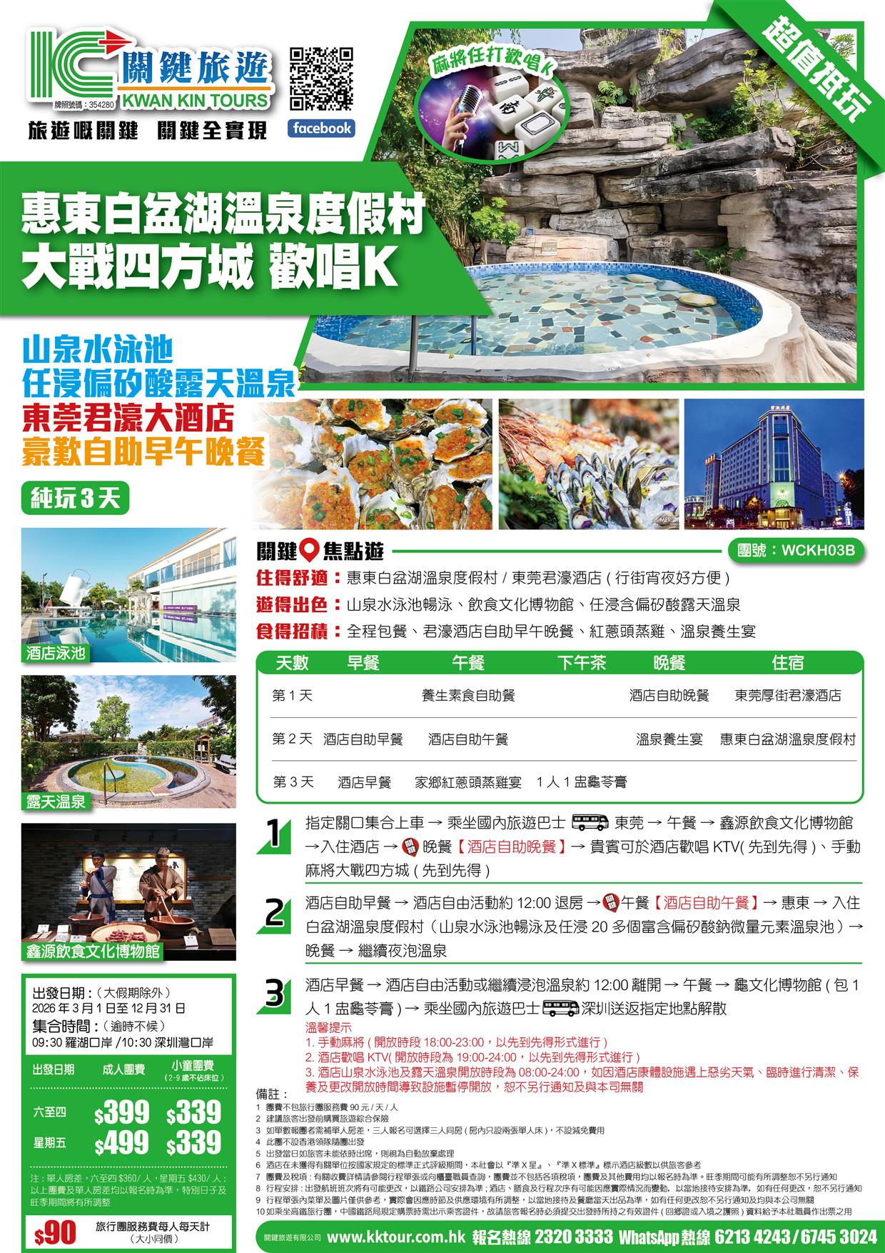 B線-超值抵玩 大戰四方城 歡唱K 豪歎自助餐 惠東白盆湖溫泉度假村 東莞君濠大酒店 純玩3天