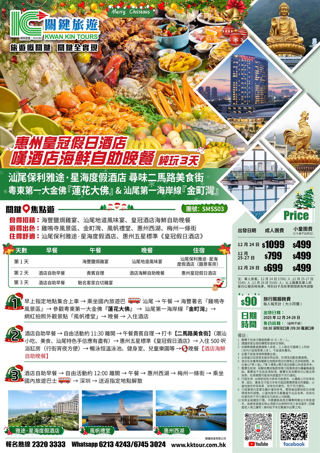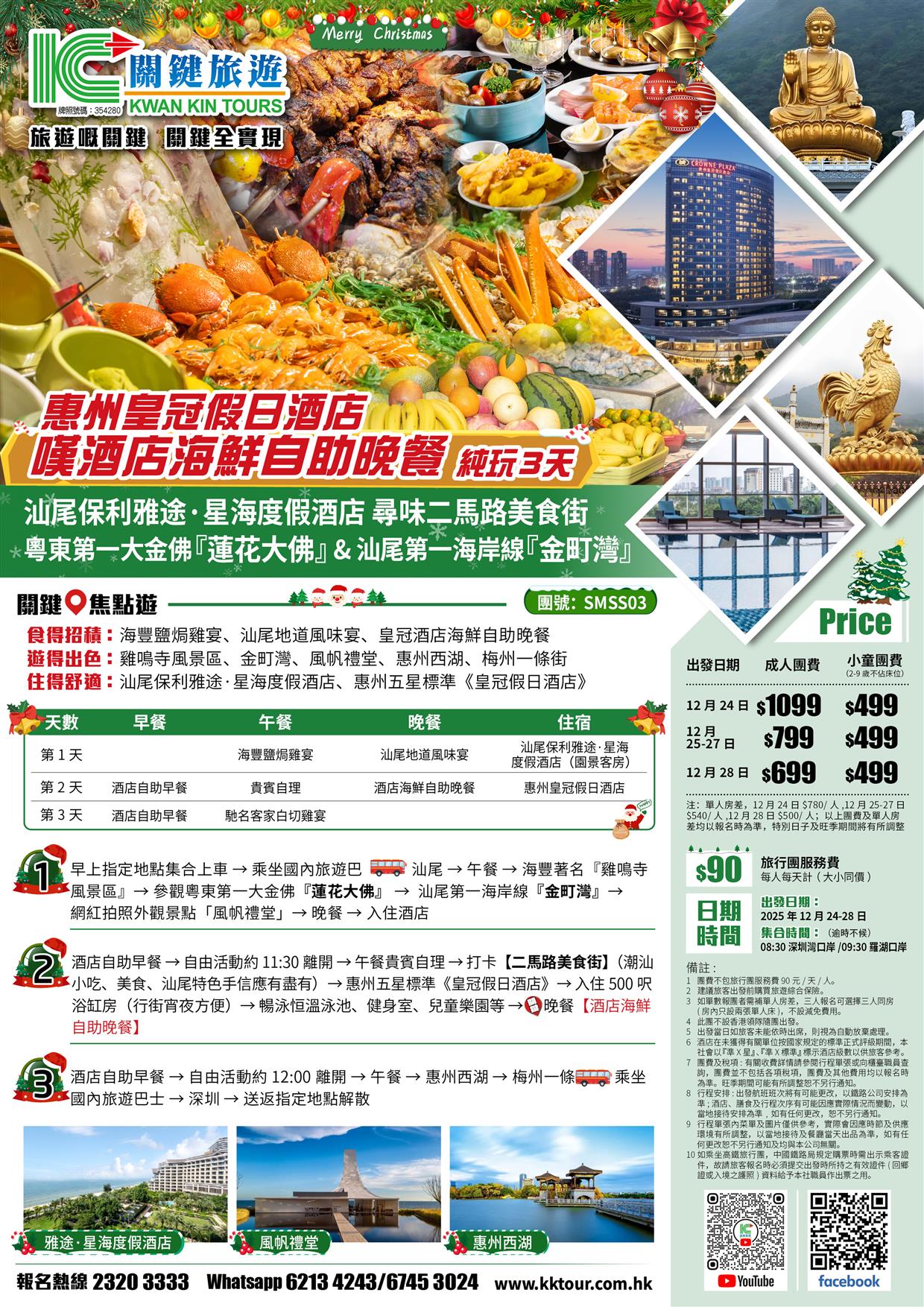 (聖誕加班)惠州皇冠假日酒店(嘆酒店海鮮自助晚餐)+汕尾保利雅途·星海度假酒店 純玩3天
