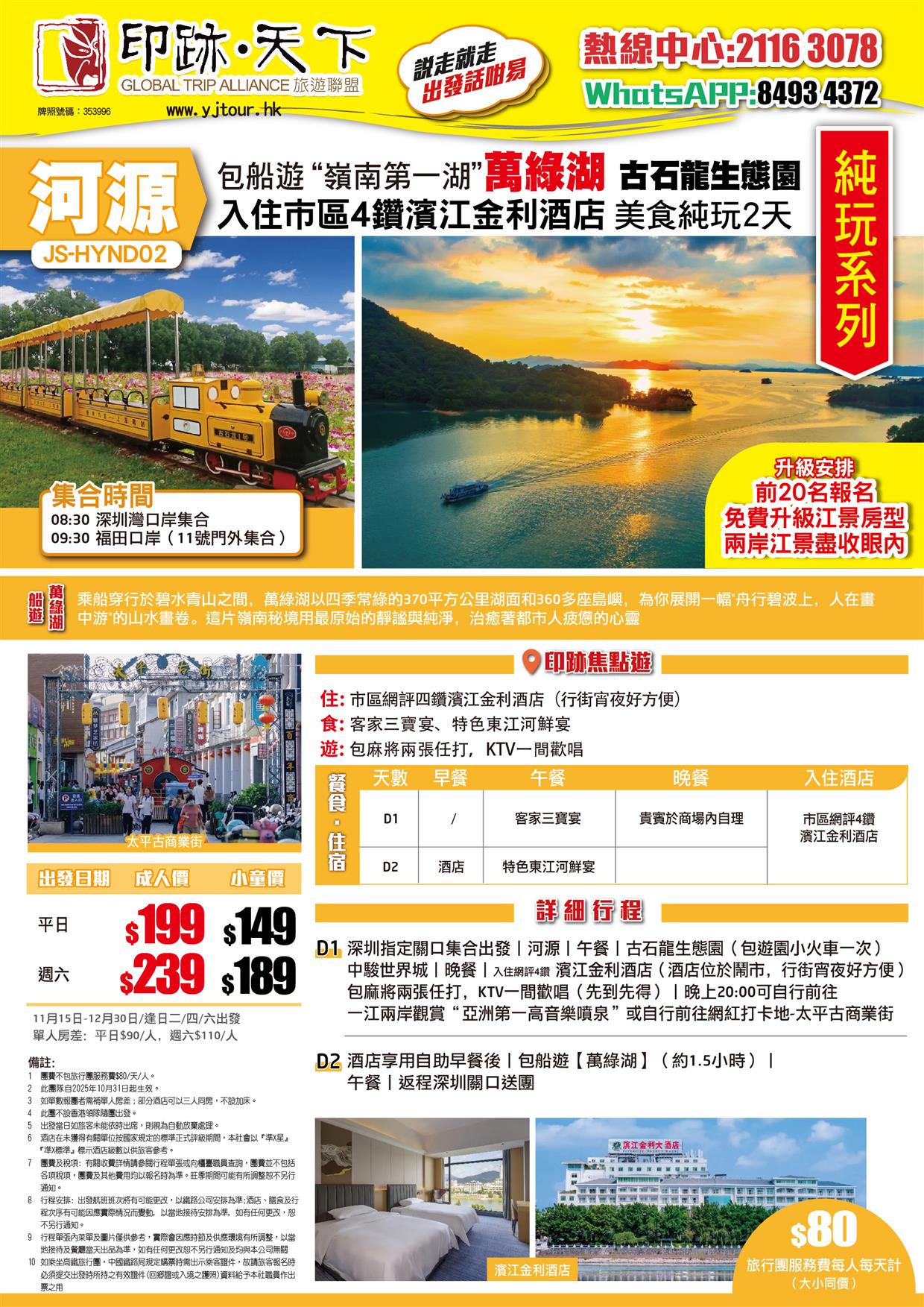秋色河源:包船遊嶺南第一湖【萬綠湖】 古石龍生態園 入住市區四鑽濱江金利酒店 美食純玩2天