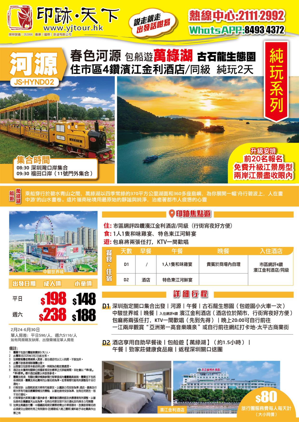 春色河源:包船遊 嶺南第一湖 【萬綠湖】 古石龍生態園 入住市區四鑽濱江金利酒店 純玩2天