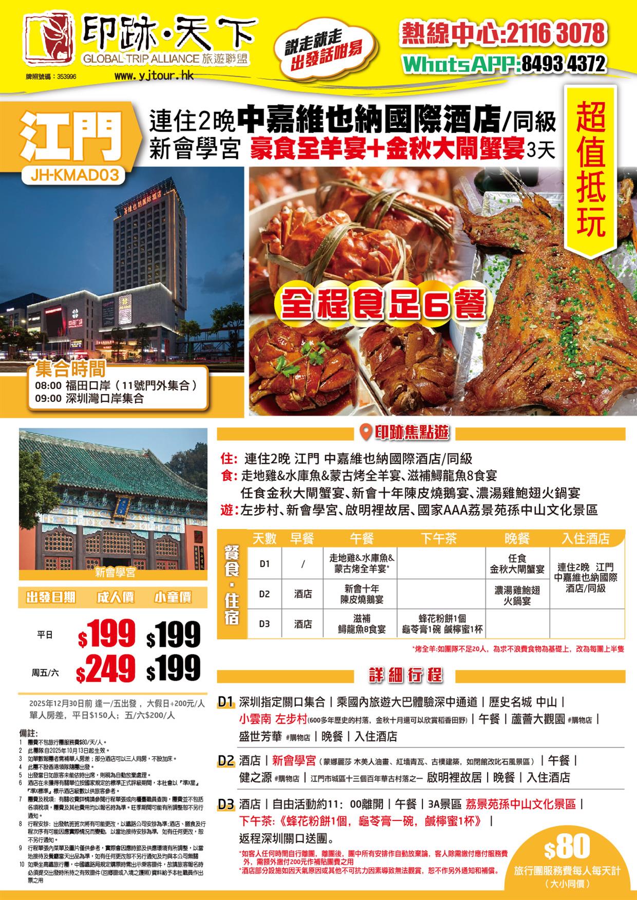江門 連住2晚中嘉維也納國際酒店/同級 逛啟明裡故居 新會學宮 豪食全羊宴+ 金秋大閘蟹宴 抵玩3天
