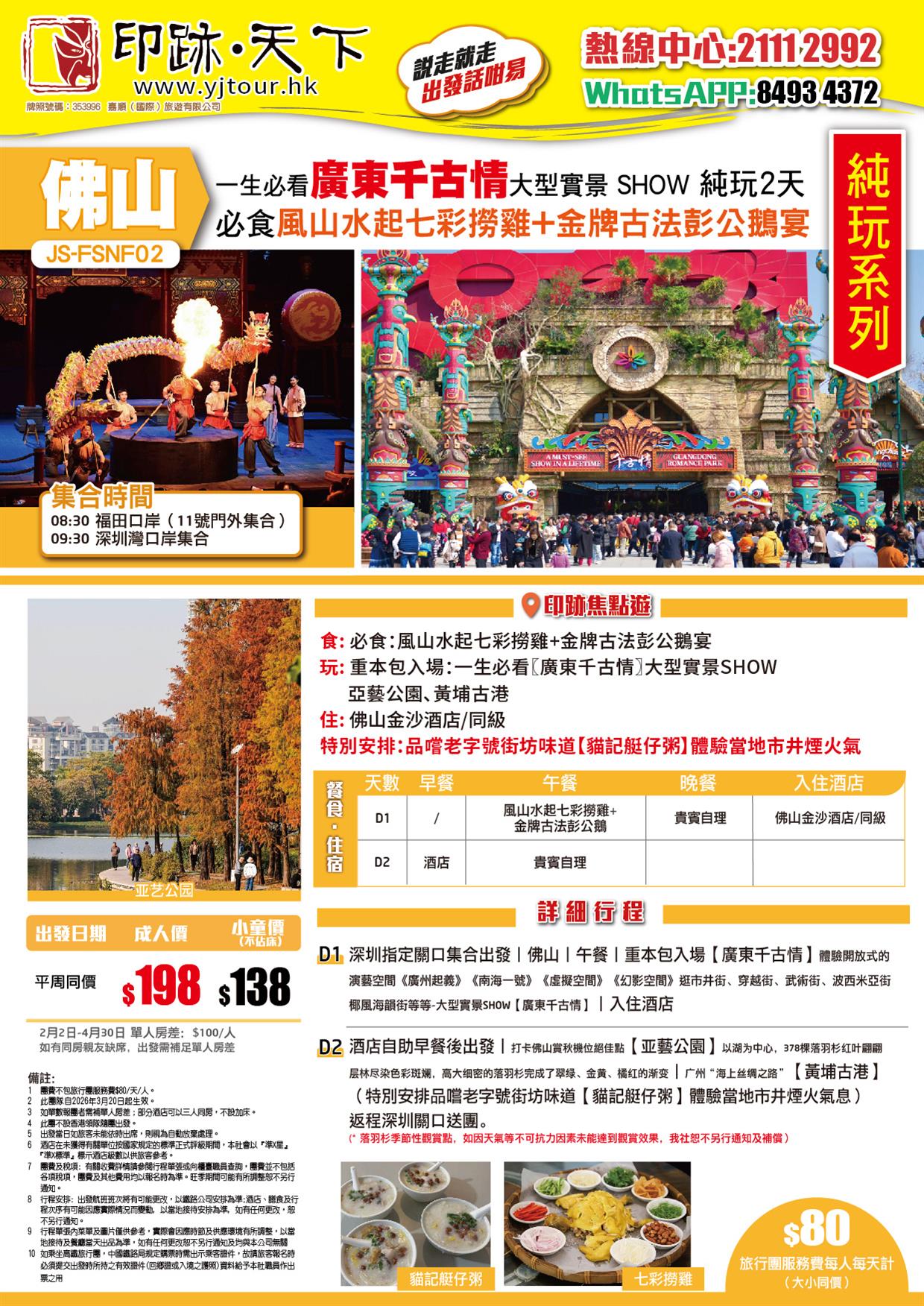 佛山 一生必看〖廣東千古情〗大型實景 SHOW 必食:風山水起七彩撈雞+金牌古法彭公鵝宴 純玩2天