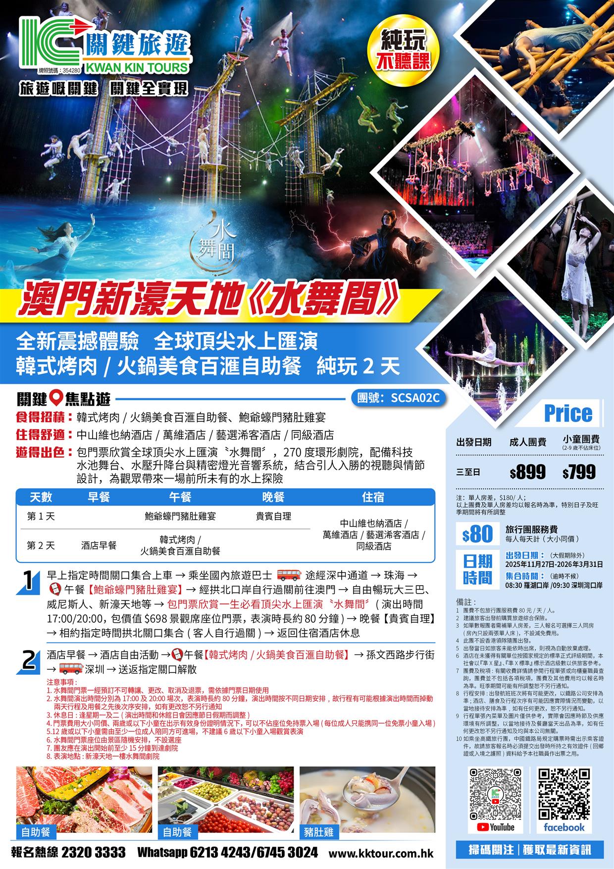 C線-澳門新濠天地水舞間 震撼體驗全球頂尖水上匯演 韓式烤肉/火鍋美食百滙自助餐純玩2天