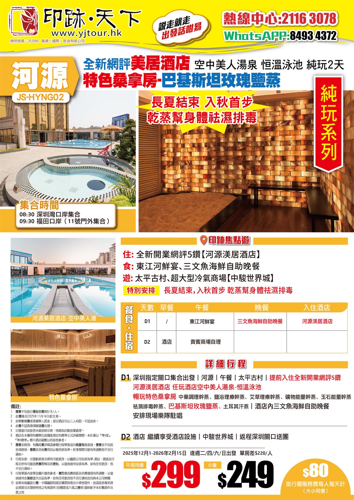 河源 全新開業攜程5鑽【河源美居酒店】特色桑拿房-巴基斯坦玫瑰鹽蒸-空中美人湯泉-恒溫泳池 純玩2天
