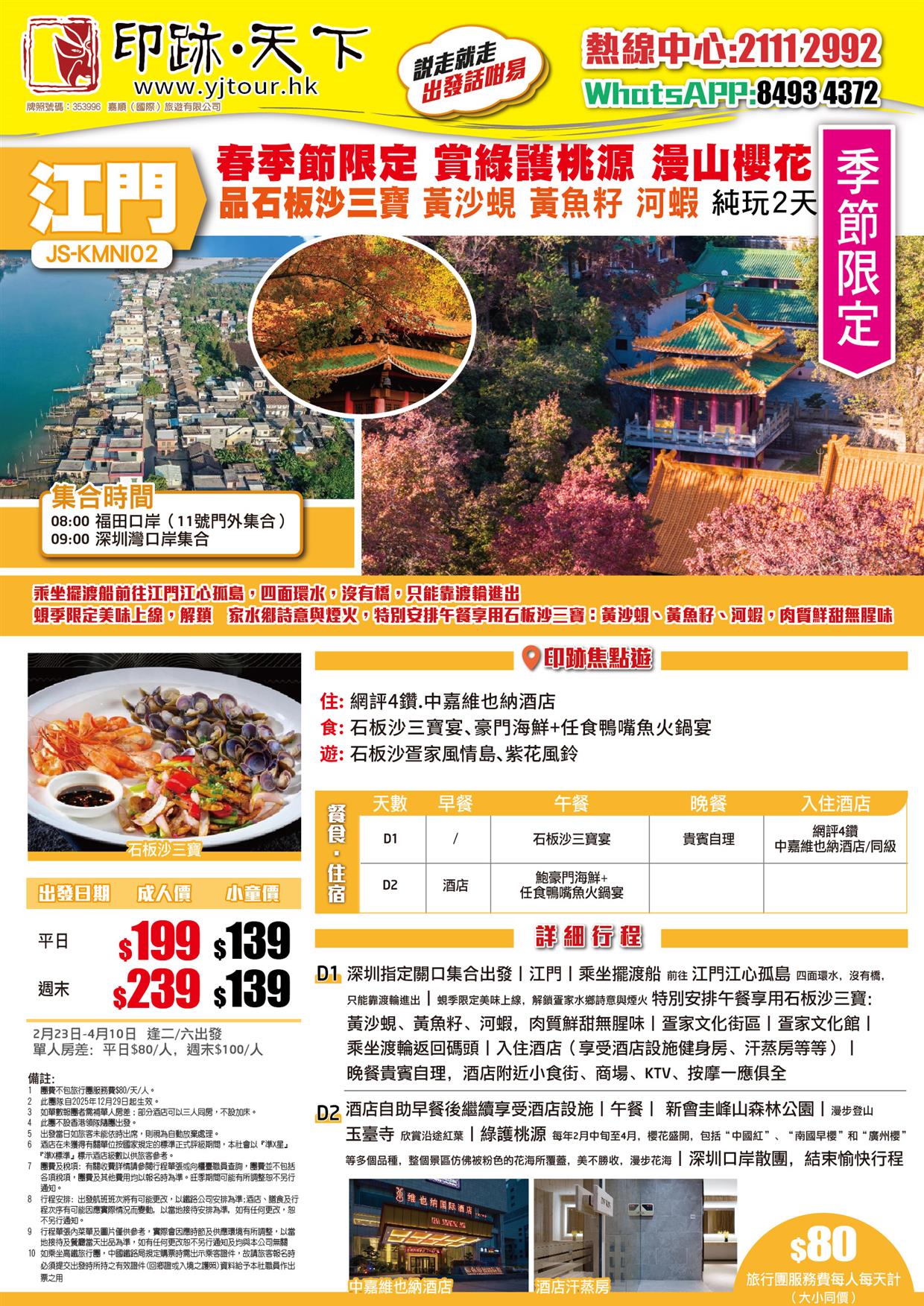 江門 春季節限定:賞绿护桃源 漫山櫻花 品石板沙三寶:黃沙蜆、黃魚籽、河蝦 純玩2天