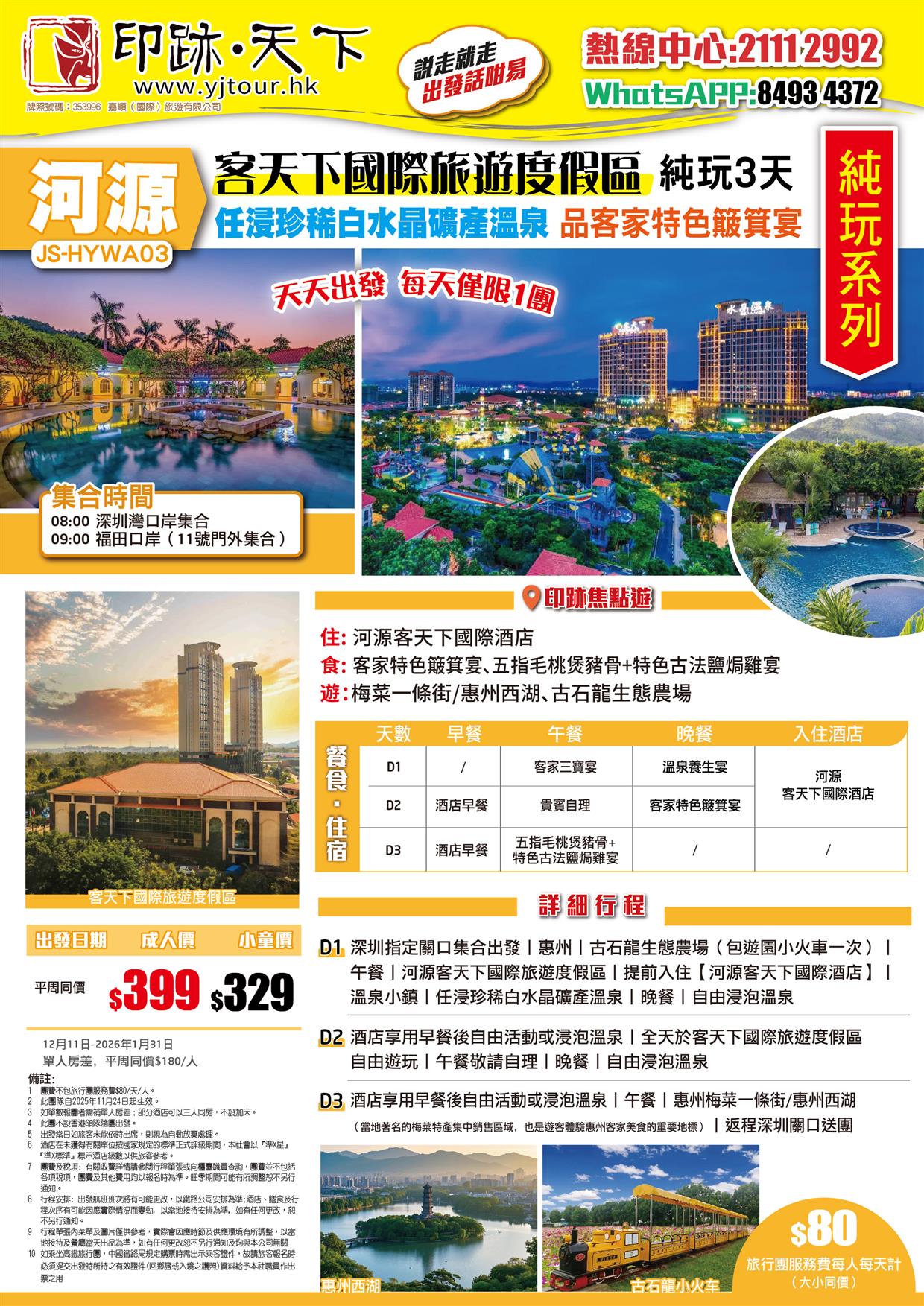 河源 連住兩晚【河源客天下國際酒店】任浸珍稀白水晶礦產溫泉、品客家特色簸箕宴 純玩3天