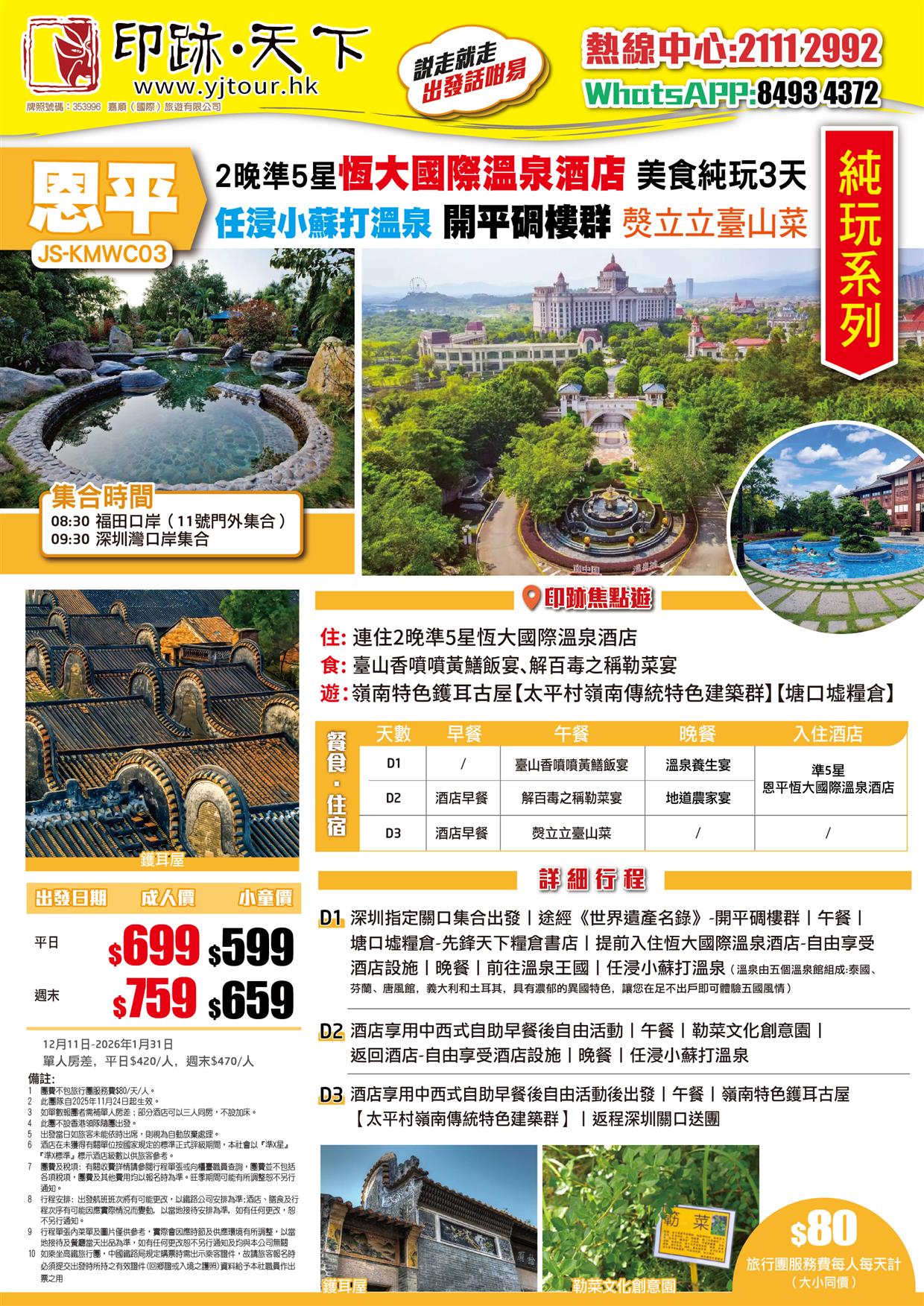 恩平連住兩晚准五星恆大國際溫泉酒店 小蘇打溫泉 《世界遺產名錄》-開平碉樓群 㷫立立臺山菜 純玩3天