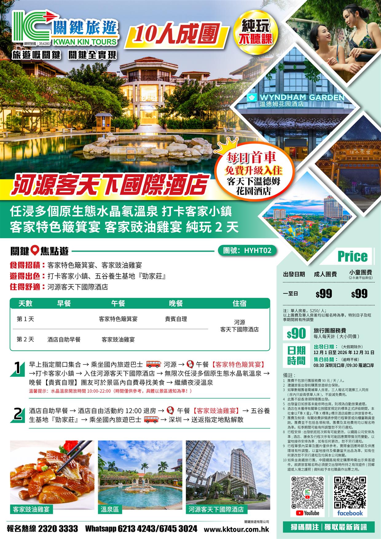 (10人成團)河源客天下國際酒店 任浸多個原生態水晶氡溫泉 打卡客家小鎮 純玩2天