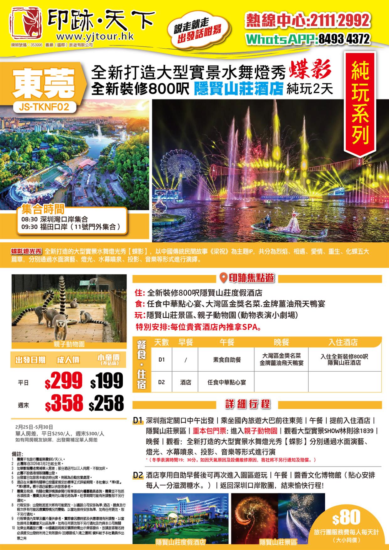 東莞 全新打造大型實景水舞燈秀《蝶影》 入住全新裝修800呎隱賢山莊酒店 純玩2天