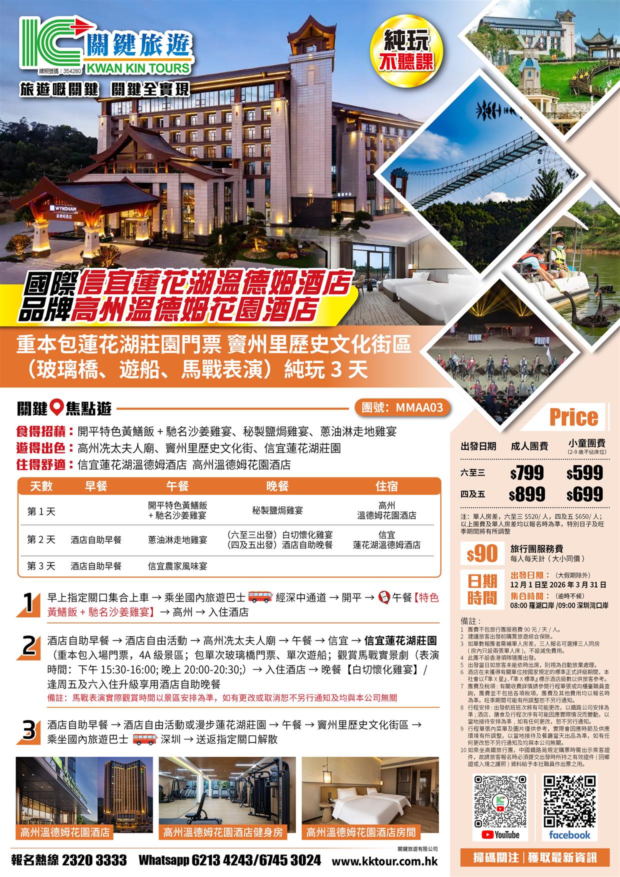 國際品牌信宜蓮花湖溫德姆酒店 高州溫德姆花園酒店 包蓮花湖莊園門票(玻璃橋、遊船、馬戰表演)純玩3天