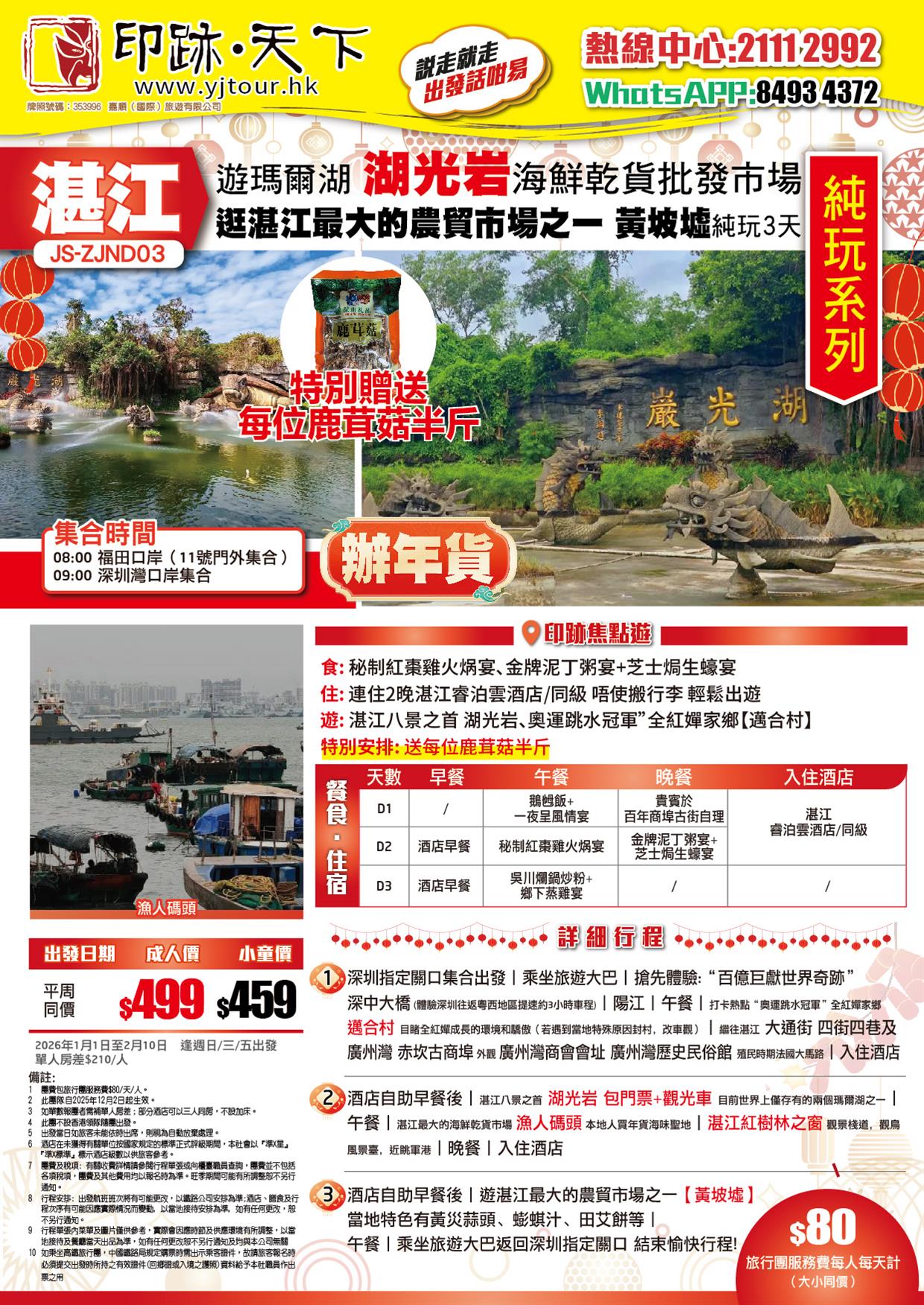 湛江 年貨季 送每位鹿茸菇半斤 最大農貿海鮮乾貨批發市場之一【黃坡墟】 遊瑪爾湖--湖光岩纯玩3天