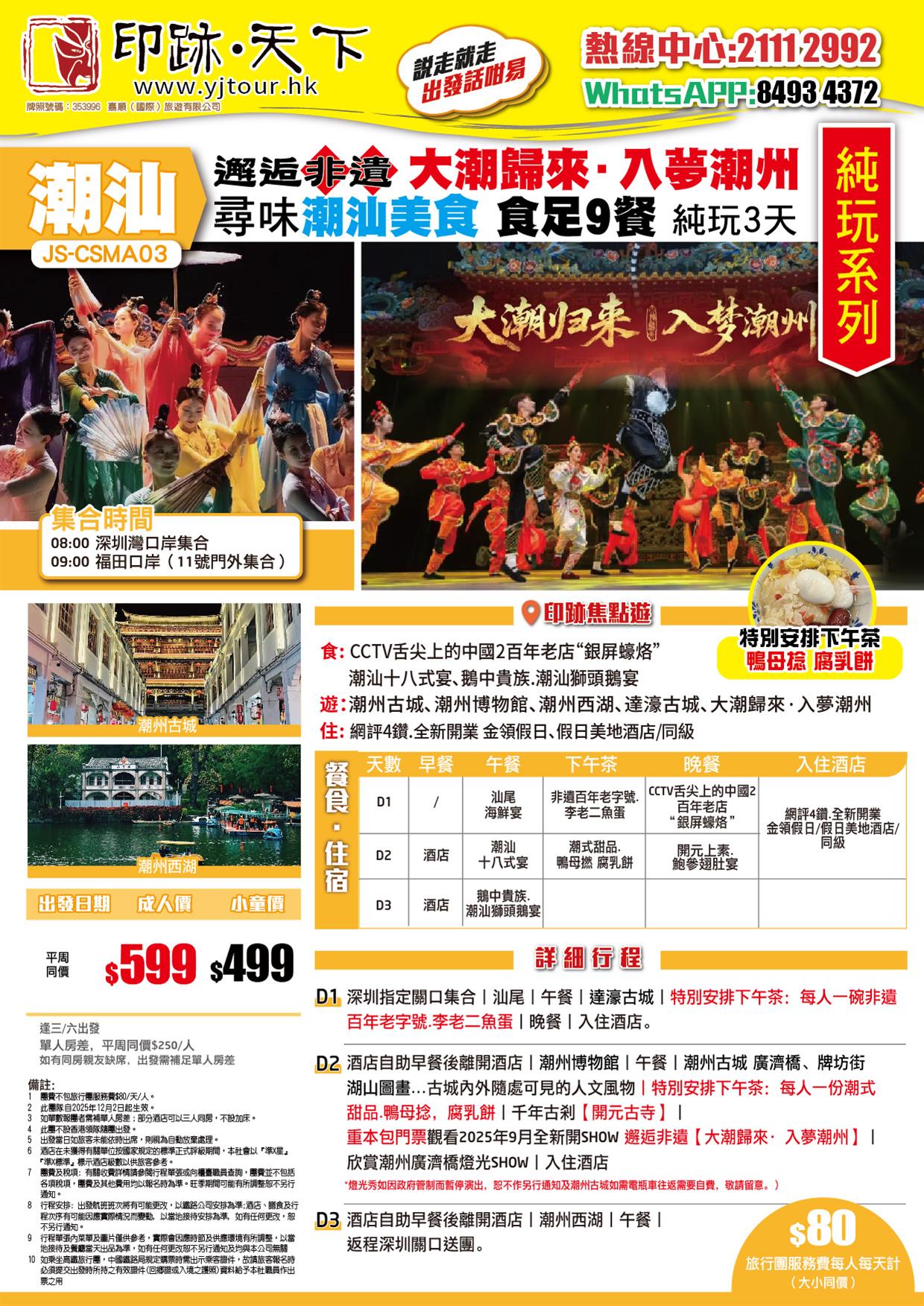 潮汕 全新開SHOW 邂逅非遺【大潮歸來·入夢潮州】 尋味美食 3天食9餐 網評4鑽金領假日純玩3天