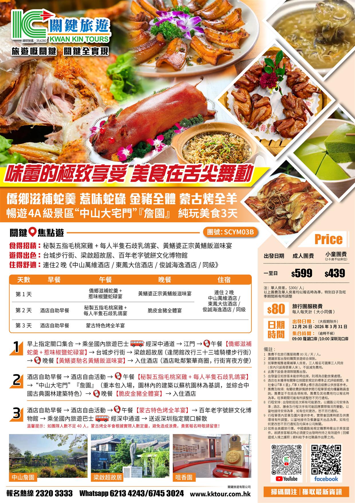 B線-僑鄉滋補蛇羹 惹味蛇碌 金豬全體 蒙古烤全羊 暢遊4A級景區中山大宅門『詹園』純玩美食3天